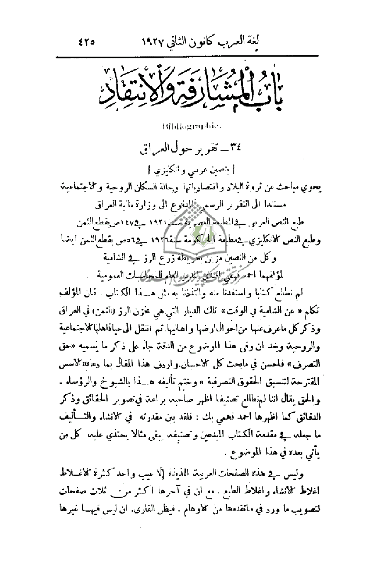 (بنصين عربي وإنكليزي) يحوي مباحث عن ثروة البلاد واقتصادياتها وحالة السكان الروحية والاجتماعية، مستندا إلى التقرير الرسمي المدفوع إلى وزارة مالية العراق، طبع النص العربي في المطبعة العصرية سنة 1926 في 147 ص بقطع الثمن، وطبع النص الإنكليزي في مطبعة الحكومة سنة 1926 في 56 ص بقطع الثمن أيضا، وكل من النصين مزين بخريطة زرع الرز في الشامية، لمؤلفها أحمد فهمي أفندي المدير العام للمحاسبات العمومية