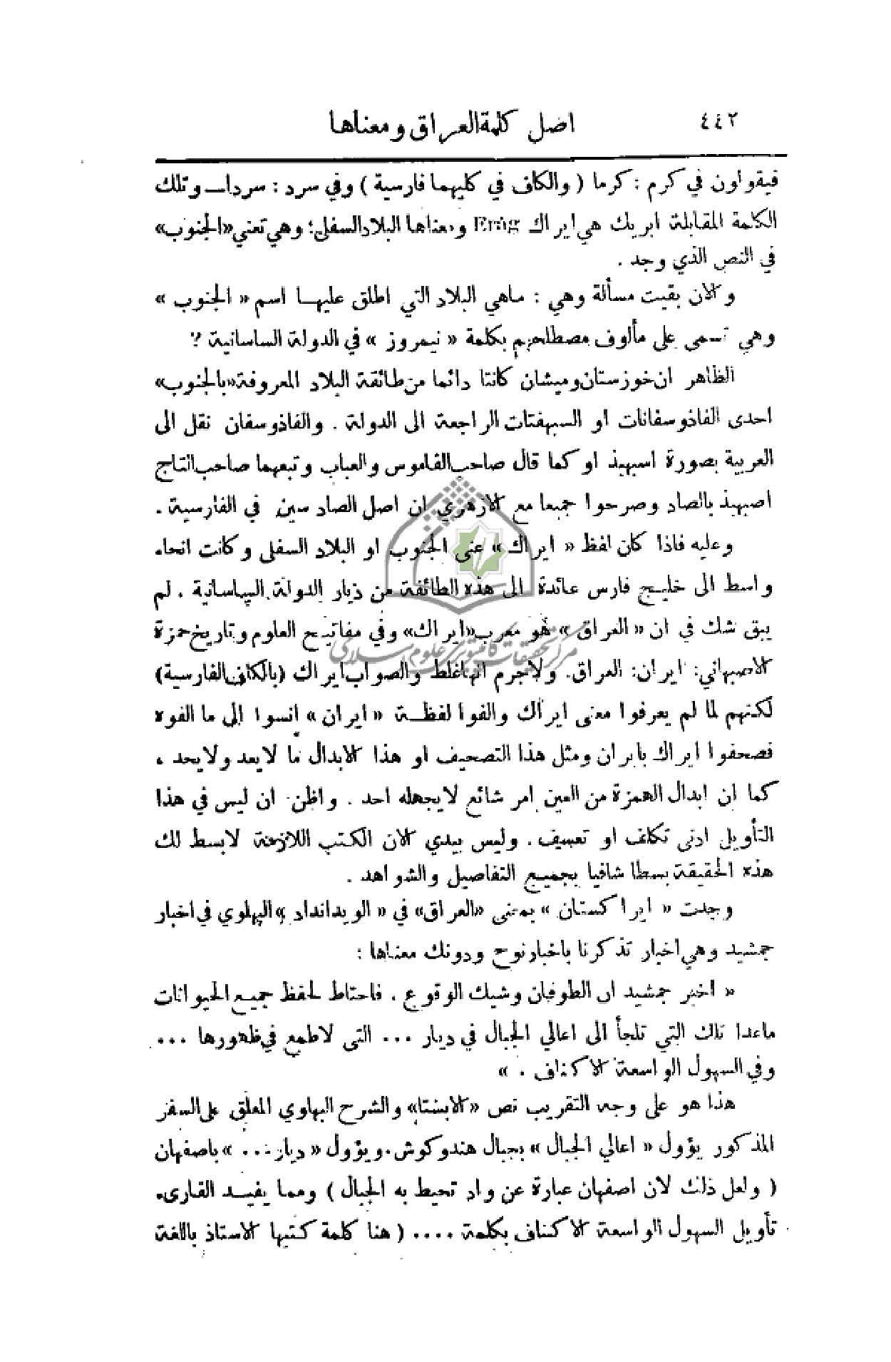 وعليه فإذا كان لفظ (ايراك) عنى الجنوب أو البلاد السفلى وكانت أنحاء واسط إلى خليج فارس عائدة إلى هذه الطائفة من ديار الدولة الساسانية، لم يبق شك في أن (العراق) هو معرب (ايراك) وفي مفاتيح العلوم وتاريخ حمزة الاصبهاني؛ إيران؛ العراق ولا جرم أنها غلط والصواب ايراك (بالكاف الفارسية) لكنهم لم يعرفوا معنى ايراك وألفوا لفظة (إيران) انسوا إلى ما ألفوه فصحفوا ايراك بإيران ومثل هذا التصحيف أو هذا الإبدال ما لا يعد ولا يحد، كما أن إبدال الهمزة من العين أمر شائع لا يجهله أحد. وأظن أن ليس في هذا التأويل أدنى تكلف أو تعسف. وليس بيدي الآن الكتب اللازمة لأبسط لك هذه الحقيقة بسطا شافيا بجميع التفاصيل والشواهد.