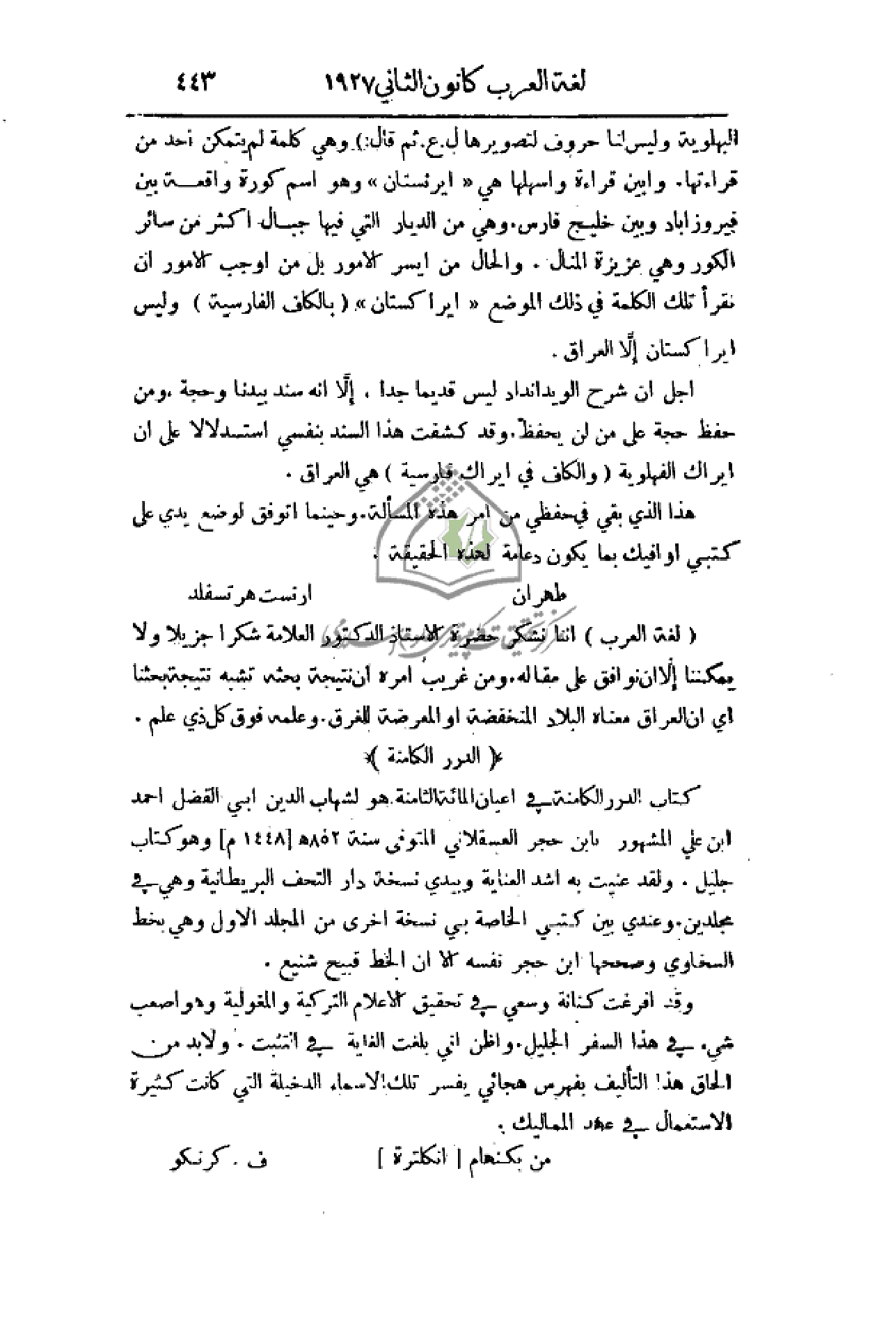 قال:) وهي كلمة لم يتمكن أحد من قراءتها. وأبين قراءة وأسهلها هي (ايرنستان) وهو اسم كورة واقعة بين فيروزاباد وبين خليج فارس. وهي من الديار التي فيها جبال اكثر من سائر الكور وهي عزيزة المنال. والحال من ايسر الأمور بل من أوجب الأمور أن تقرأ تلك الكلمة في ذلك الموضع (ايراكستان) (بالكاف الفارسية) وليس ايراكستان إلاَّ العراق.