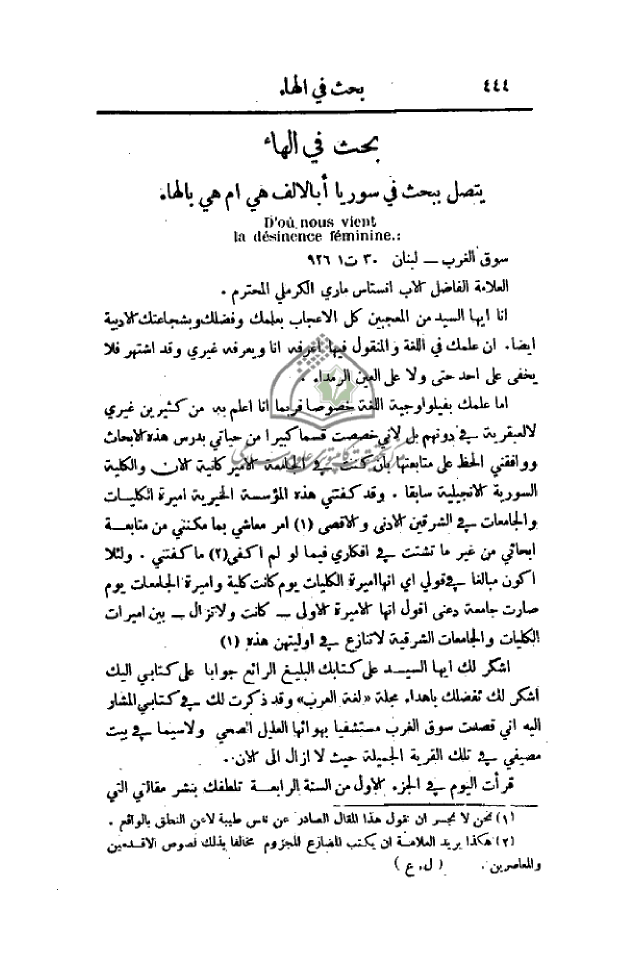 أما علمك بفيلولوجية اللغة خصوصا فربما أنا اعلم به من كثيرين غيري لا لعبقرية في دونهم بل لأني خصصت قسما كبيرا من حياتي بدرس هذه الأبحاث ووافقني الحظ على متابعتها بأن كنت في الجامعة الأميركانية الآن والكلية السورية الإنجيلية سابقا. وقد كفتني هذه المؤسسة الخيرية أميرة الكليات والجامعات في الشرقين الأدنى والأقصى أمر معاشي بما مكنني من متابعة أبحاثي من غير ما تشتت في أفكاري فيما لو لم أكفى ما كفتني. ولئلا أكون مبالغا في قولي أي أنها أميرة الكليات يوم كانت كلية وأميرة الجامعات يوم صارت جامعة دعني أقول إنها الأميرة الأولى - كانت ولا تزال - بين أميرات الكليات والجامعات الشرقية لا تنازع في أوليتهن هذه