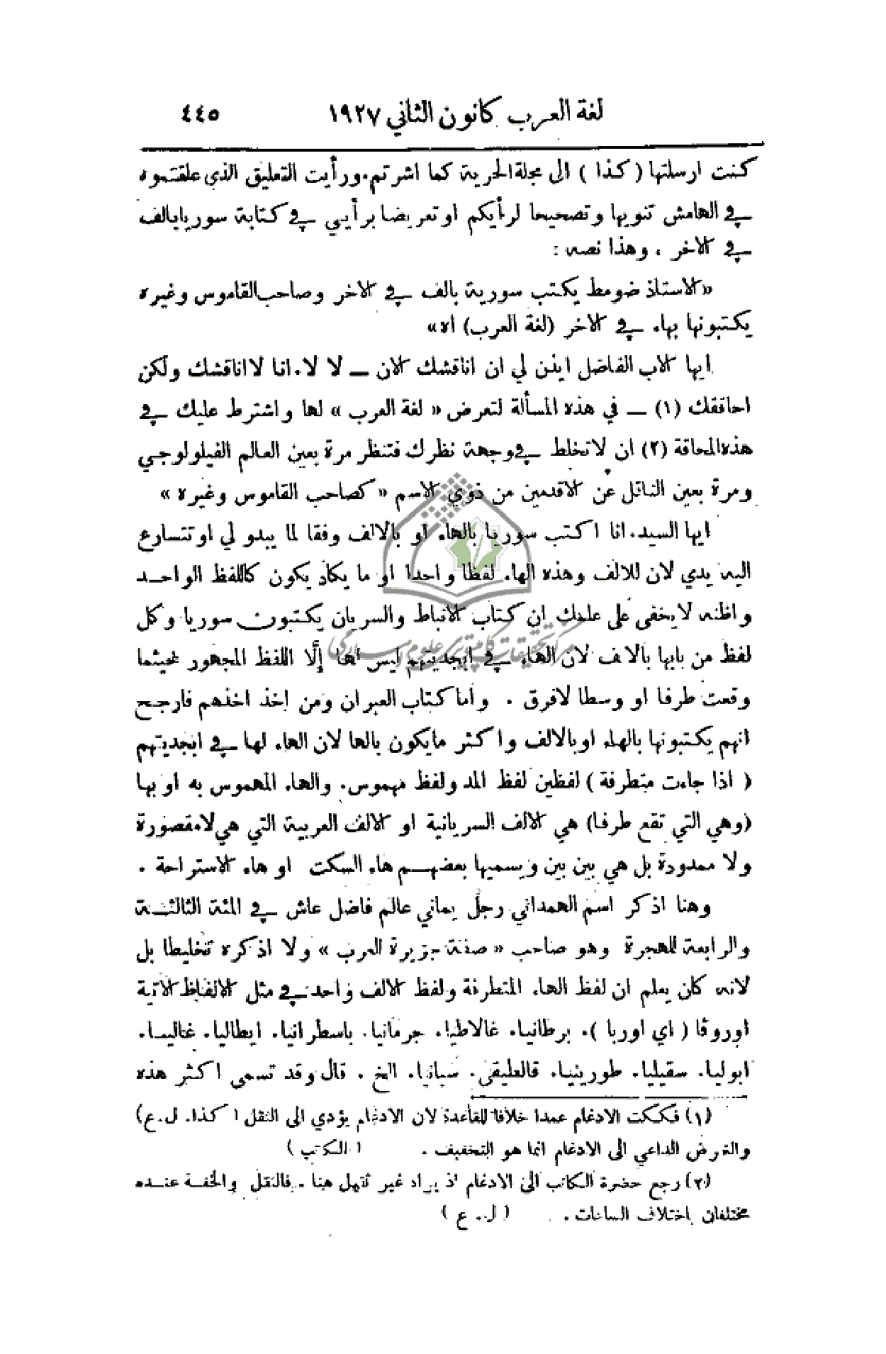 كنت أرسلتها (كذا) إلى مجلة الحرية كما أشرتم. ورأيت التعليق الذي علقتموه في الهامش تنويها وتصحيحا لرأيكم أو تعريضا برأيي في كتابة سوريا بألف في الآخر، وهذا نصه:
