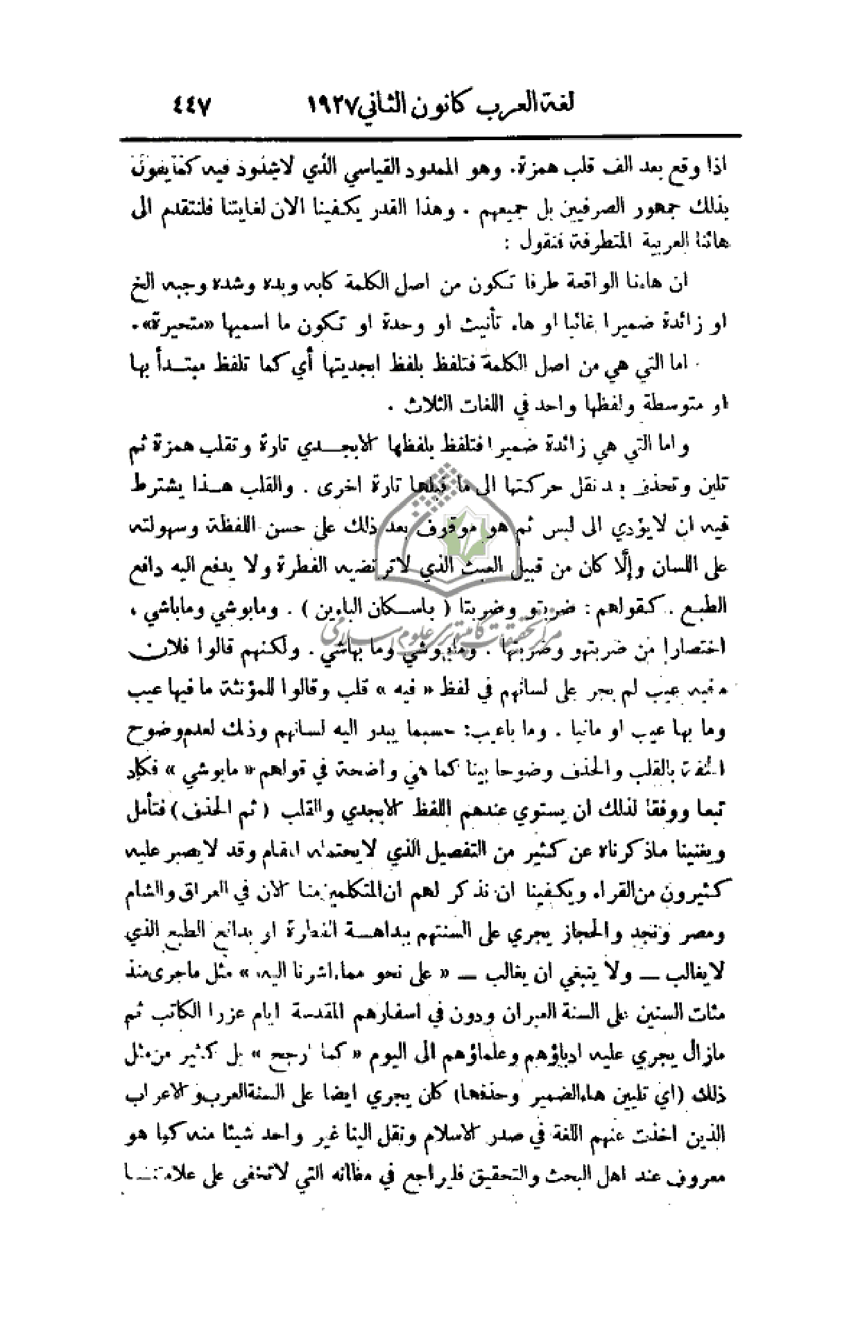 إذا وقع بعد ألف قلب همزة. وهو الممدود القياسي الذي لا شذوذ فيه كما يقول بذلك جمهور الصرفيين بل جميعهم. وهذا القدر يكفينا الآن لغايتنا فلنتقدم إلى هائنا العربية المتطرفة فنقول: