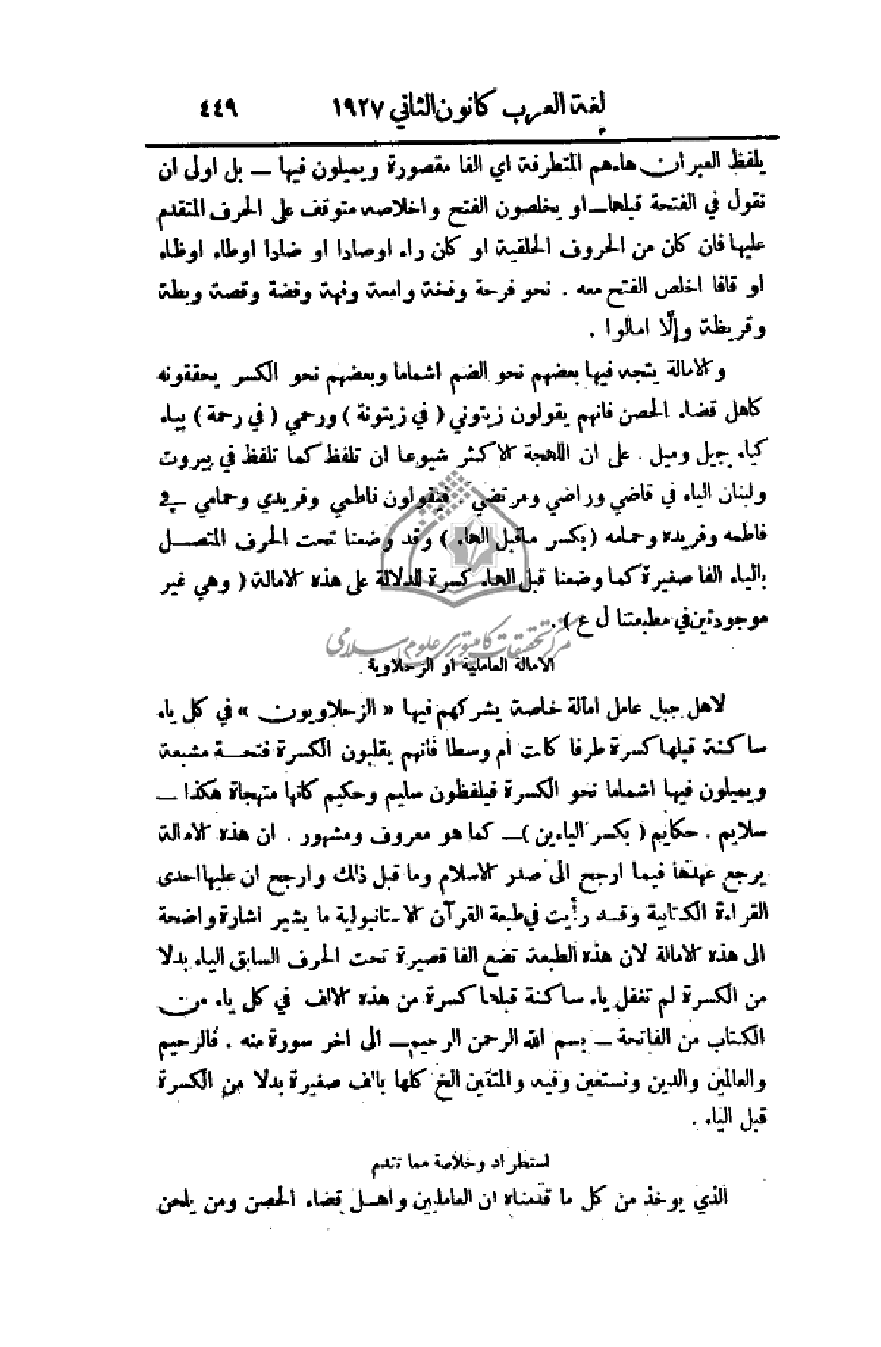 لأهل جبل عامل إمالة خاصة يشركهم فيها (الزحلاويون) في كل ياء ساكنة قبلها كسرة طرفا كانت أم وسطا فإنهم يقلبون الكسرة فتحة مشبعة ويميلون فيها إشماما نحو الكسرة فيلفظون سليم وحكيم كأنها متهجاة هكذا - سلايم. حكايم (بكسر الياءين) - كما هو معروف ومشهور. إن هذه الإمالة يرجع عهدها فيما ارجح إلى صدر الإسلام وما قبل ذلك وارجح أن عليها إحدى القراءة الكتابية وقد رأيت في طبعة القرآن الاستانبولية ما يشير إشارة واضحة إلى هذه الإمالة لأن هذه الطبعة تضع ألفا قصيرة تحت الحرف السابق الياء بدلا