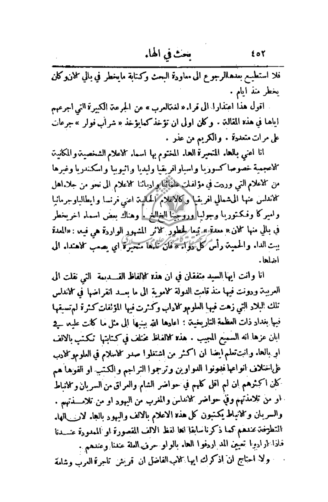 أنا اعني بالهاء المتحيرة الهاء المختوم بها أسماء الأعلام الشخصية والمكانية الأعجمية خصوصا كسوريا واسيا وأفريقيا وليديا وأثيوبيا وإسكندريا وغيرها من الأعلام التي وردت في مؤلفات علمائنا وأدبائنا الأعلام إلى نحو من جلاء أهل الأندلس عنها إلى شمالي أفريقيا وكالأعلام الحالية اعني فرنسا وإيطاليا وجرمانيا وأميركا وفكتوريا وجوليا وروجينا الخ الخ. وهناك بعض أسماء أخر يخطر في بالي منها الآن (معدة) تبعا لخطور الأثر المشهور الواردة هي فيه: (المعدة بيت الداء والحمية رأس كل دواء) فإن تاءها متحيرة أي يصعب الاهتداء إلى اصلها.