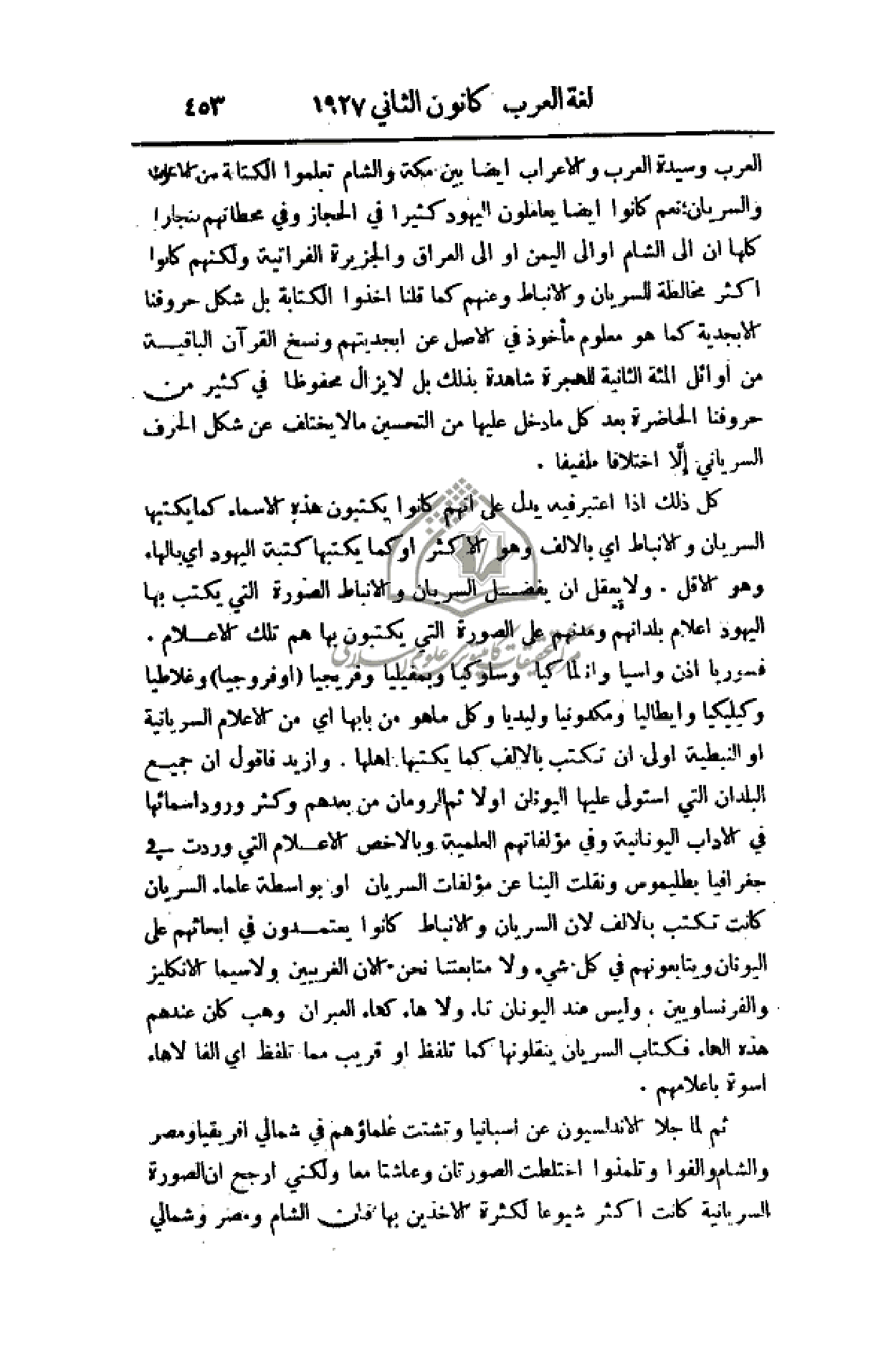 كل ذلك إذا اعتبر فيه يدل على انهم كانوا يكتبون هذه الأسماء كما يكتبها السريان والأنباط أي بالألف وهو الأكثر أو كما يكتبها كتبة اليهود أي بالهاء وهو الأقل. ولا يعقل أن يفضل السريان والأنباط الصورة التي يكتب بها اليهود أعلام بلدانهم ومدنهم على الصورة التي يكتبون بها هم تلك الأعلام. فسوريا إذن واسيا وانطاكيا وسلوكيا وبمفيليا وفريجيا (أو فروجيا) غلاطيا وكيليكيا وإيطاليا ومكدونيا وليديا وكل ما هو من بابها أي من الأعلام السريانية أو النبطية أولى أن تكتب بالألف كما يكتبها أهلها. وأزيد فأقول إن جميع البلدان التي استولى عليها اليونان أولا ثم الرومان من بعدهم وكثر ورود أسمائها في الآداب اليونانية وفي مؤلفاتهم العلمية وبالأخص الأعلام التي وردت في جغرافيا بطليموس ونقلت إلينا عن مؤلفات السريان أو بواسطة علماء السريان كانت تكتب بالألف لأن السريان والأنباط كانوا يعتمدون في أبحاثهم على اليونان ويتابعونهم في كل شيء ولا متابعتنا نحن الآن الغربيين ولا سيما الإنكليز والفرنساويين؛ وليس عند اليونان تاء ولا هاء كهاء العبران وهب كان عندهم هذه الهاء فكتّاب السريان ينقلونها كما تلفظ أو قريب مما تلفظ أي ألفا لا هاء أسوة بأعلامهم.