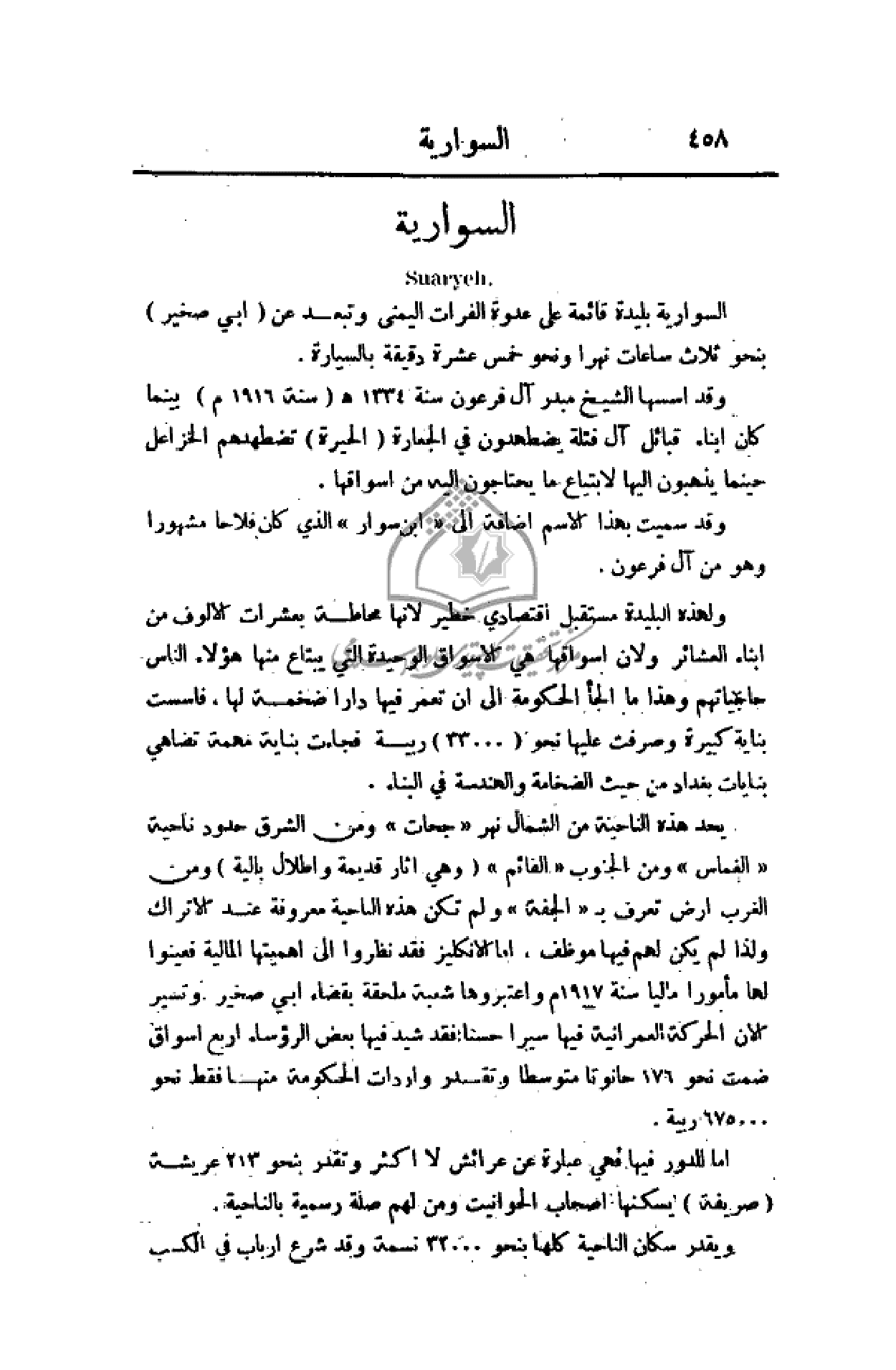 يحد هذه الناحية من الشمال نهر (جحات) ومن الشرق حدود ناحية (الغماس) ومن الجنوب (القائم) (وهي آثار قديمة وأطلال بالية) ومن الغرب أرض تعرف ب (الجفة) ولم تكن هذه الناحية معروفة عند الأتراك ولذا لم يكن لهم فيها موظف، أما الإنكليز فقد نظروا إلى أهميتها المالية فعينوا لها مأمورا ماليا سنة 1917م واعتبروها شعبة ملحقة بقضاء أبي صخير. وتسير الآن الحركة العمرانية فيها سيرا حسنا فقد شيد فيها بعض الرؤساء أربع أسواق ضمت نحو 1760 حانوتا متوسطا وتقدر واردات الحكومة منها فقط نحو 675000 ربية.