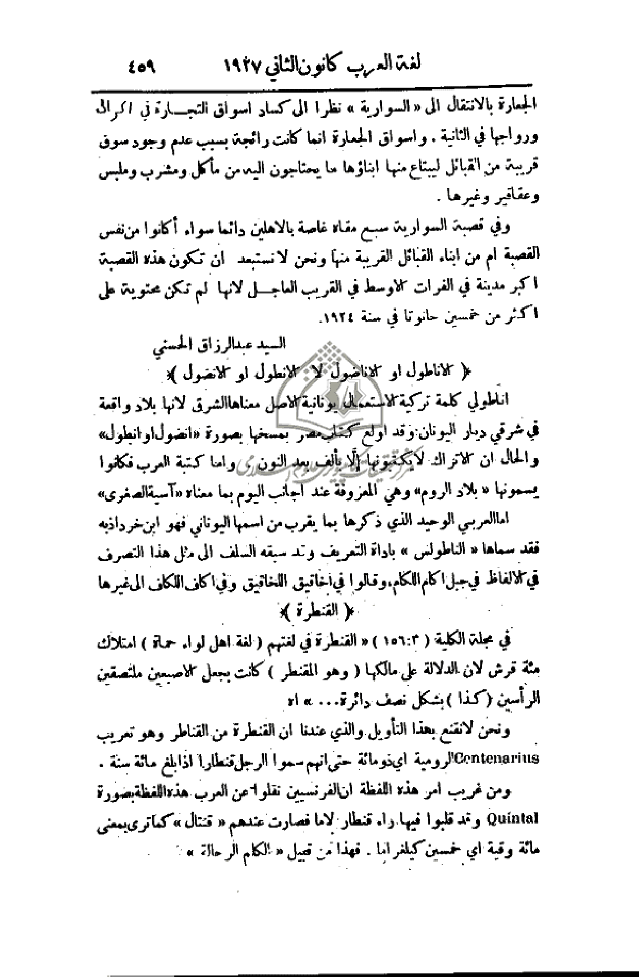 ومن غريب أمر هذه اللفظة إن الفرنسيين نقلوا عن العرب هذه اللفظة بصورة وقد قلبوا فيها راء قنطار لاما فصارت عندهم (قنتال) كما ترى بمعنى مائة وقية أي خمسين كيلو غراما. فهذا من قبيل (الكلم الرحالة).