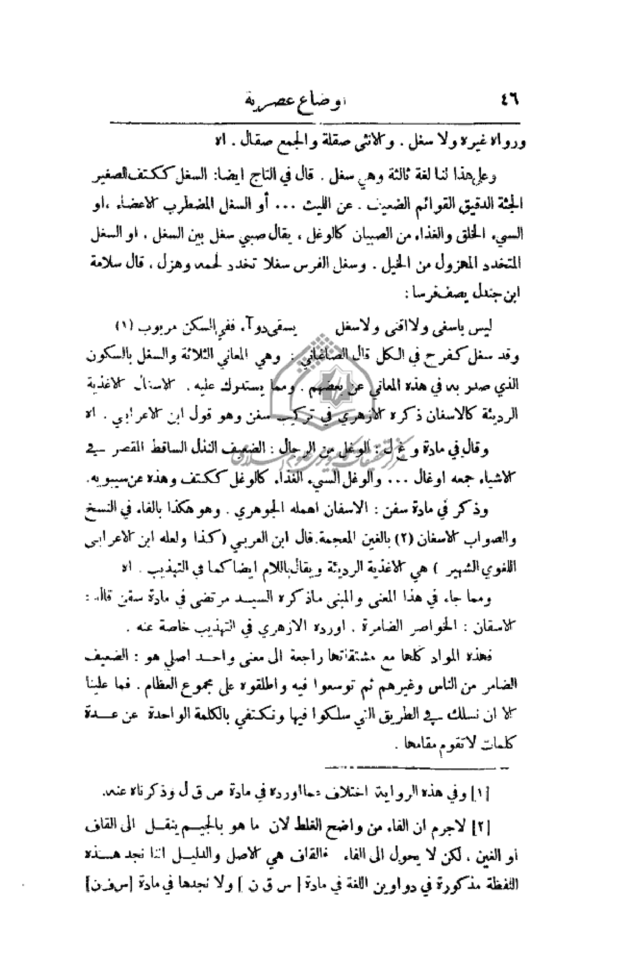 وقال في مادة وغ ل: الوغل من الرجال: الضعيف النذل الساقط المقصر في الأشياء جمعه أوغال. . . والوغل السيئ الغذاء كالوغل ككتف وهذه عن سيبويه. وذكر في مادة سفن: الآسفان أهمله الجوهري. وهو هكذا بالفاء في النسخ والصواب الآسفان بالغين المعجمة. قال ابن العربي (كذا ولعله ابن الأعرابي اللغوي الشهير) هي الأغذية الرديئة ويقال باللام أيضاً كما في التهذيب. أهـ