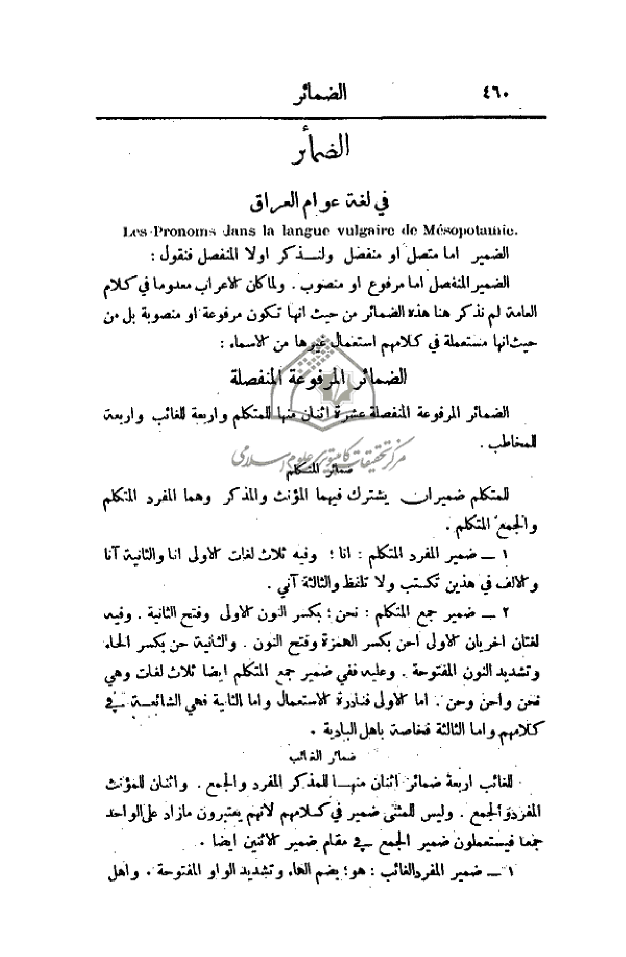 للغائب أربعة ضمائر اثنان منها للمذكر المفرد والجمع. واثنان للمؤنث المفرد والجمع. وليس للمثنى ضمير في كلامهم لأنهم يعتبرون ما زاد على الواحد جمعا فيستعملون ضمير الجمع في مقام ضمير الاثنين أيضا.