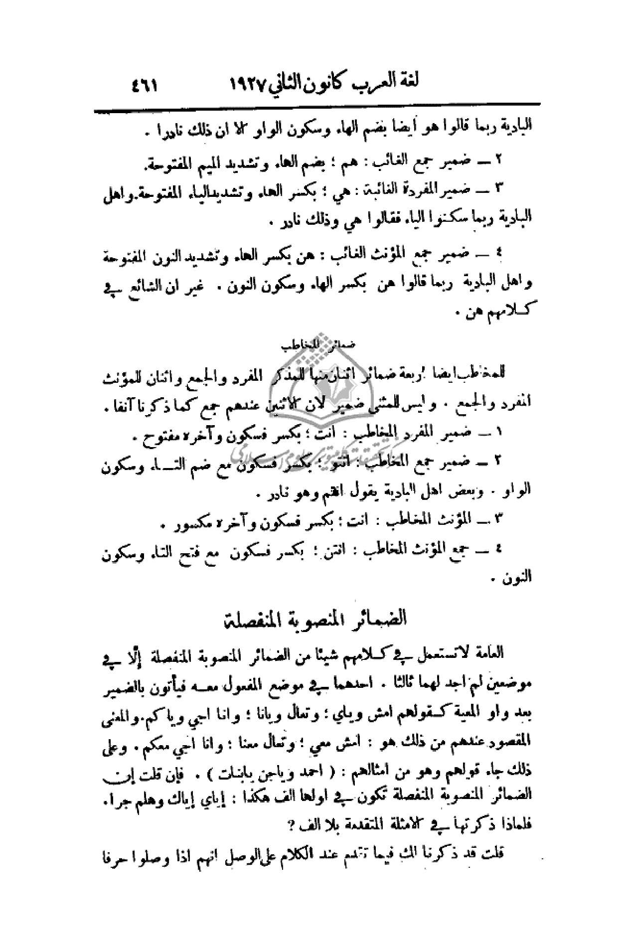 4 - ضمير جمع المؤنث الغائب: هن بكسر الهاء وتشديد النون المفتوحة وأهل البادية ربما قالوا هن بكسر الهاء وسكون النون. غير أن الشائع في كلامهم هن.