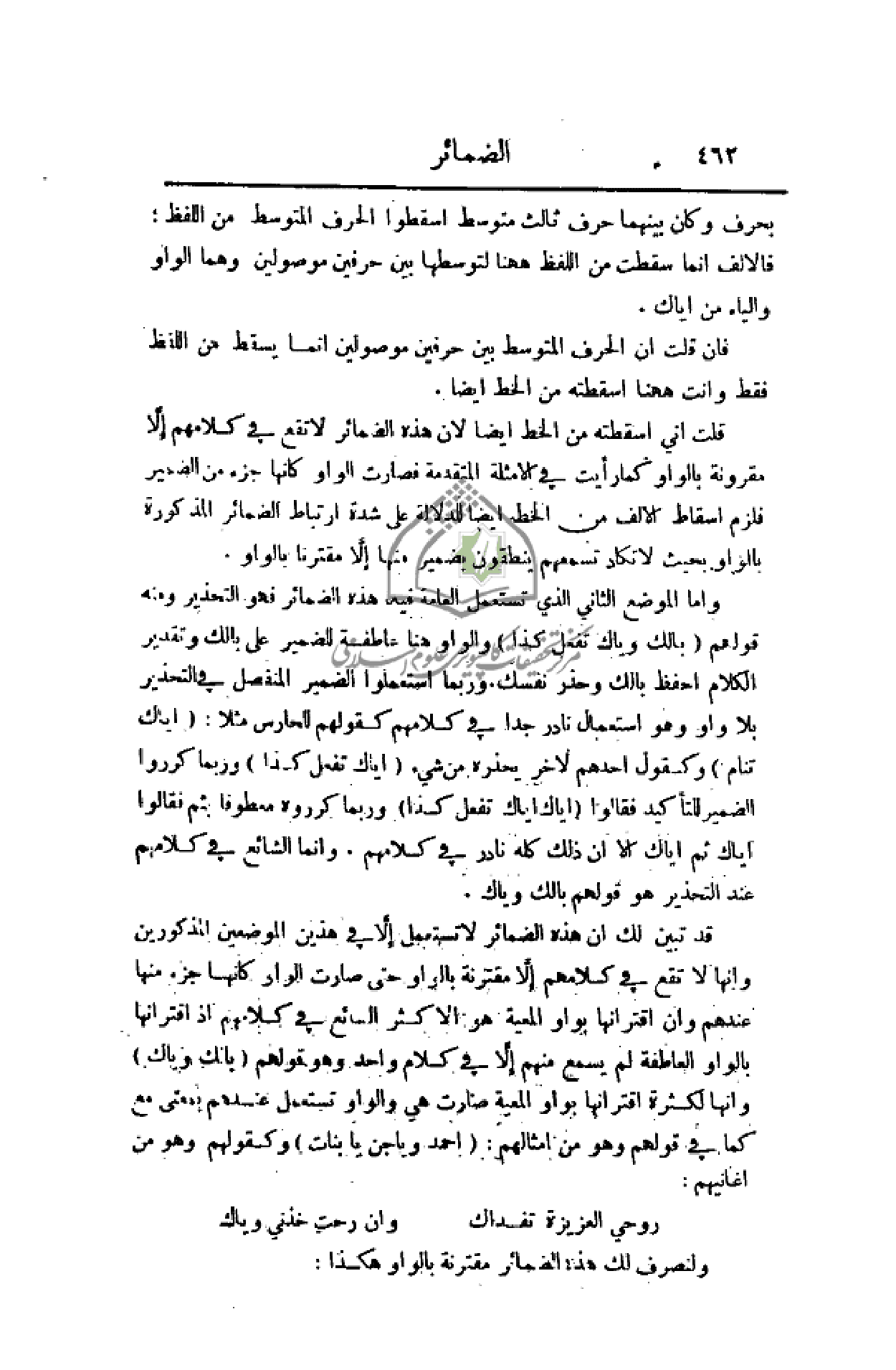 رأيت في الأمثلة المتقدمة فصارت الواو كأنها جزء من الضمير فلزم إسقاط الألف من الخط أيضا للدلالة على شدة ارتباط الضمائر المذكورة بالواو بحيث لا تكاد تسمعهم ينطقون بضمير منها إلاَّ مقترنا بالواو.
