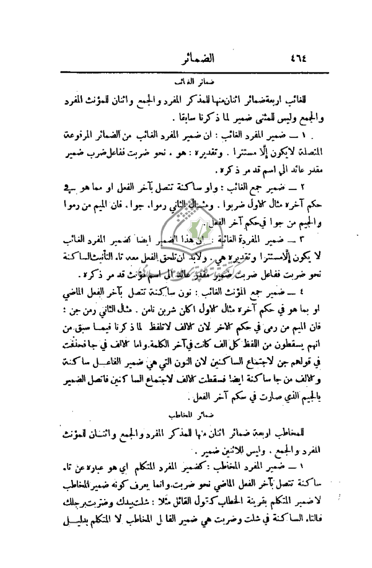 1 - ضمير المفرد الغائب: أن ضمير المفرد الغائب من الضمائر المرفوعة المتصلة لا يكون إلاَّ مستترا. وتقديره: هو. نحو ضربت ففاعل ضرب ضمير مقدر عائد إلى اسم قد مر ذكره.