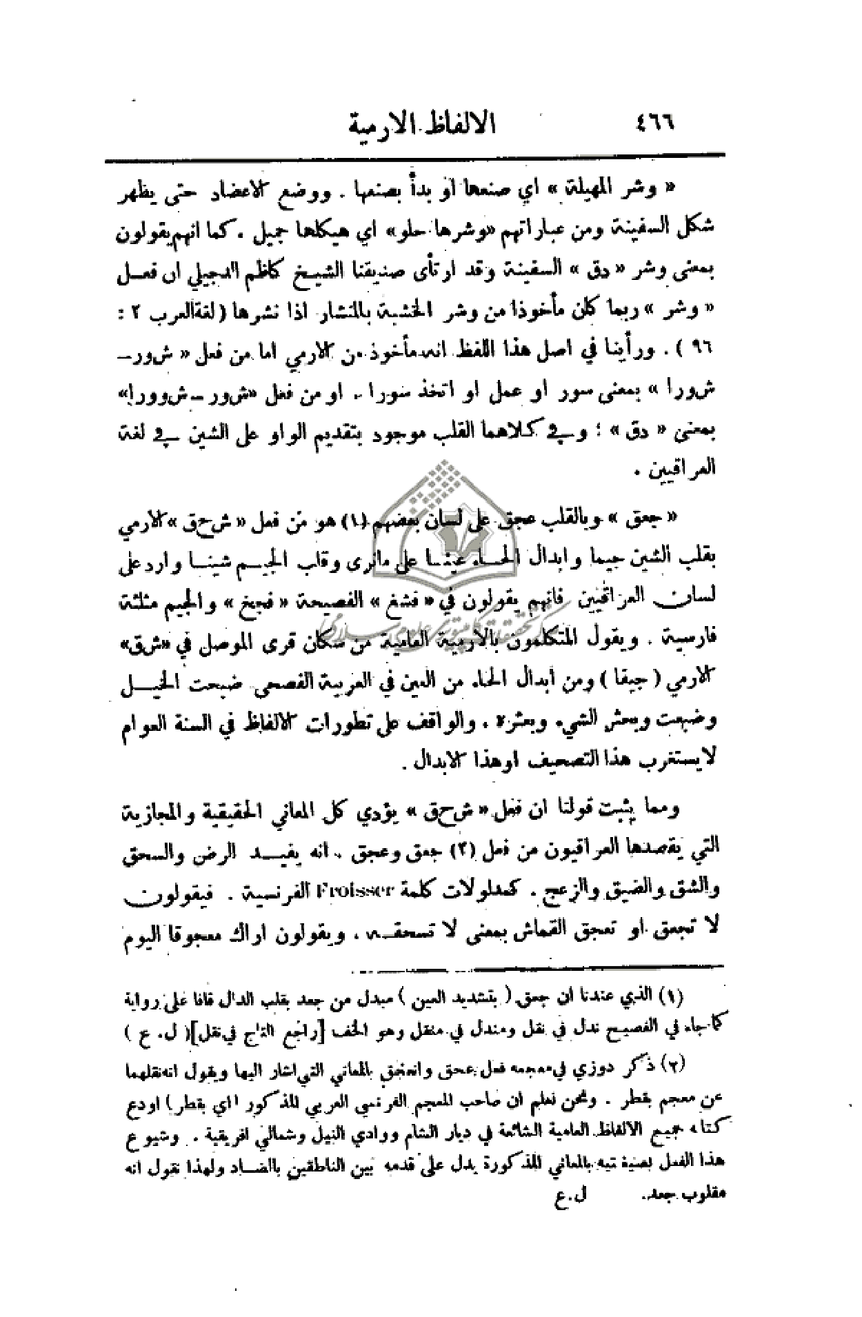 (جعق) وبالقلب عجق على لسان بعضهم وهو من فعل (ش ح ق) الارمي بقلب الشين جيما وإبدال الحاء عينا على ما نرى وقلب الجيم شينا وارد على لسان العراقيين فإنهم يقولون في (فشغ) الفصيحة (فجخ) والجيم مثلثة فارسية. ويقول المتكلمون بالارمية العامية من سكان قرى الموصل في (ش ق) الارمي (جيقا) ومن إبدال الحاء من العين في العربية الفصحى ضبحت الخيل وضبعت وبحثر الشيء وبعثره، والواقف على تطورات الألفاظ في ألسنة العوام لا يستغرب هذا التصحيف أو هذا الإبدال.