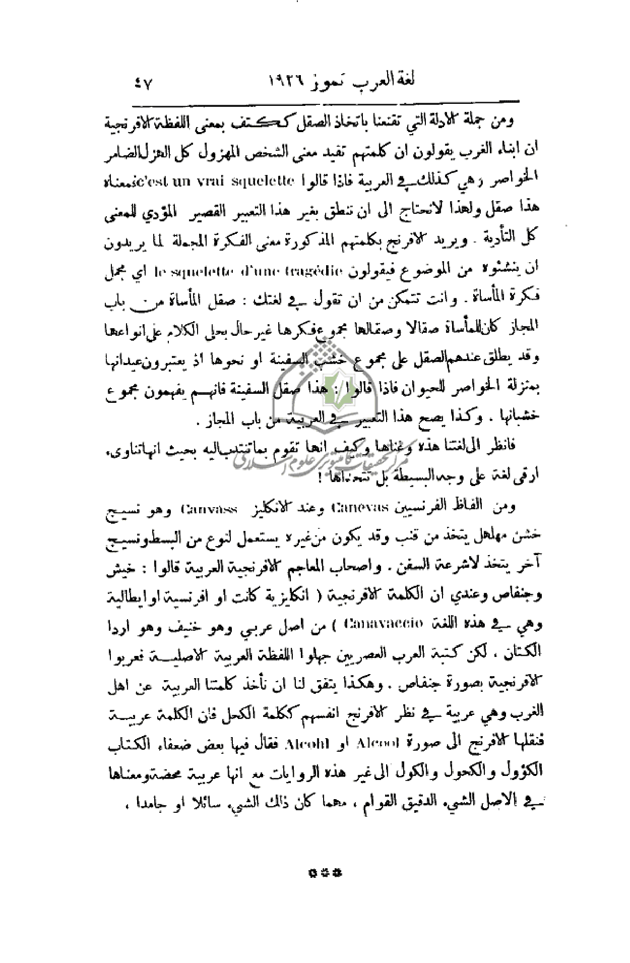 ومن ألفاظ وعند الإنكليز وهو نسيج خشن مهلهل يتخذ من قنب وقد يكون من غيره يستعمل لنوع من البسط ونسيج آخر يتخذ لأشرعة السفن. وأصحاب المعاجم الإفرنجية العربية قالوا: خيش وجنفاص وعندي أن الكلمة الإفرنجية (إنكليزية كانت أو افرنسية أو إيطالية وهي في هذه من أصل عربي وهو خنيف وهو أردا الكتان، لكن كتبة العرب العصريين جهلوا اللفظة العربية الأصلية فعربوا الإفرنجية بصورة جنفاص. وهكذا يتفق لنا أن نأخذ كلمتنا العربية عن أهل الغرب وهي عربية في نظر الإفرنج أنفسهم ككلمة الكحل فان الكلمة عربية فنقلها الإفرنج إلى صورة أو فقال فيها بعض ضعفاء الكتاب الكؤول والكحول والكول إلى غير هذه الروايات مع إنها عربية محضة ومعناها في الأصل الشيء الدقيق القوام، مهما كان ذلك الشيء سائلا أو جامدا.