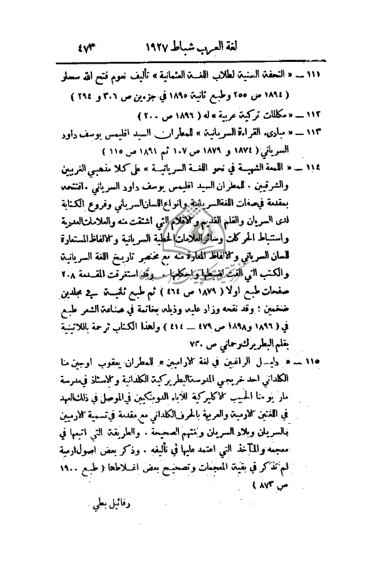 113 - (مبادئ القراءة السريانية) للمطران السيد اقليمس يوسف داود السرياني (1874 و1879 ص107 ثم 1891 ص115)
