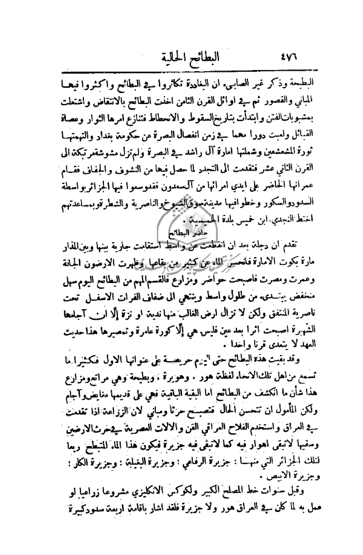 وقد بقيت هذه البطائح حتى اليوم حريصة على عنوانها الأول فكثيرا ما تسمع من أهل تلك الأنحاء لفظة هور، وهويرة، وبطيحة وهي مراتع ومزارع هذا شأن ما انكشف من البطائح أما البقية الباقية فهي على قديمها مغايض وآجام ولكن المأمول أن تتحسن الحال فتصبح حرثا ومباني لأن الزراعة إذا تقدمت في العراق واستخدم الفلاح العراقي الفن والآلات العصرية في حرث الأرضين وسقيها لا تبقى اهوار فيه كما لا تبقى فيه جزيرة فيكون هذا الماء المتبطح ريعا لتلك الجزائر التي منها: جزيرة الرفاعي؛ وجزيرة البغيلة، وجزيرة الكار، وجزيرة الأبيض.
