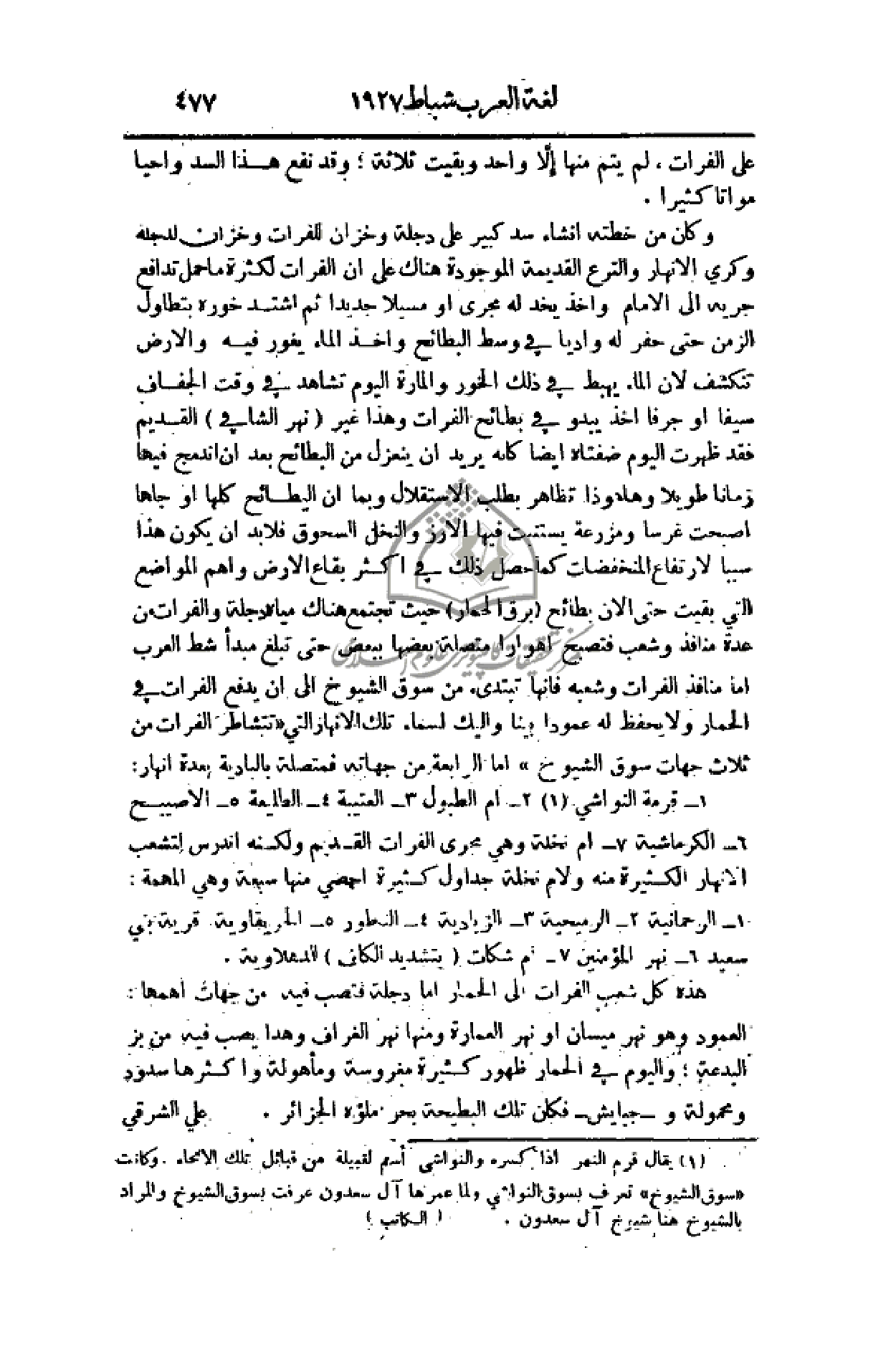 زمنا طويلا وهاهو ذا تظاهر بطلب الاستقلال وبما أن البطائح كلها أو جلها أصبحت غرسا ومزرعة يستنبت فيها الأرز والنخل السحوق فلا بد أن يكون هذا سببا لارتفاع المنخفضات كما حصل ذلك في اكثر بقاع الأرض واهم المواضع التي بقيت حتى الآن بطائح (برق الحمار) حيث تجتمع هناك مياه دجلة والفرات من عدة منافذ وشعب فتصبح اهوارا متصلة بعضها ببعض حتى تبلغ مبدأ شط العرب أما منافذ الفرات وشعبه فإنها تبتدئ من سوق الشيوخ إلى أن يدفع الفرات في الحمار ولا يحفظ عمودا بينا وإليك أسماء تلك الأنهار التي (تتشاطر الفرات من ثلاث جهات سوق الشيوخ) أما الرابعة من جهاته فمتصلة بالبادية بعدة انهار: