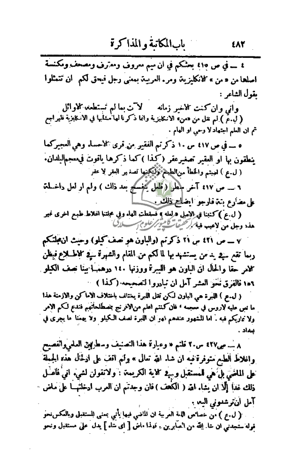 7 - ص421 س21 ذكرتم (والباون هو نصف كيلو) وحيث أن مجلتكم ربما تقع في يد من يستشهد بها لما لكم من المقام والشهرة في الاطلاع فيظن الأمر حقا والحال أن الباون هو الليبرة ووزنها 140 درهما بينا نصف الكيلو 156 فالفرق نحو العشر آمل أن تبادروا لتصحيحه (كذا)