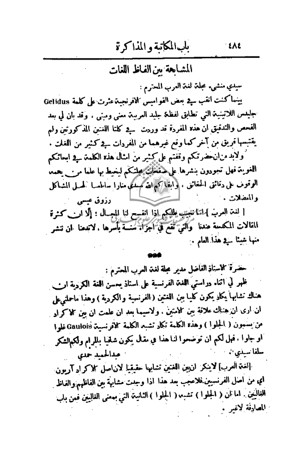 ولا بد من أن حضرتكم وقفتم على كثير من أمثال هذه الكلمة في أبحاثكم اللغوية فهل تجودون بنشرها على صفحات مجلتكم ليحيط بها علما من يهمه الوقوف على دقائق الحقائق. وأبقاكم الله سيدي منارا ساطعا لحل المشاكل والمعضلات.