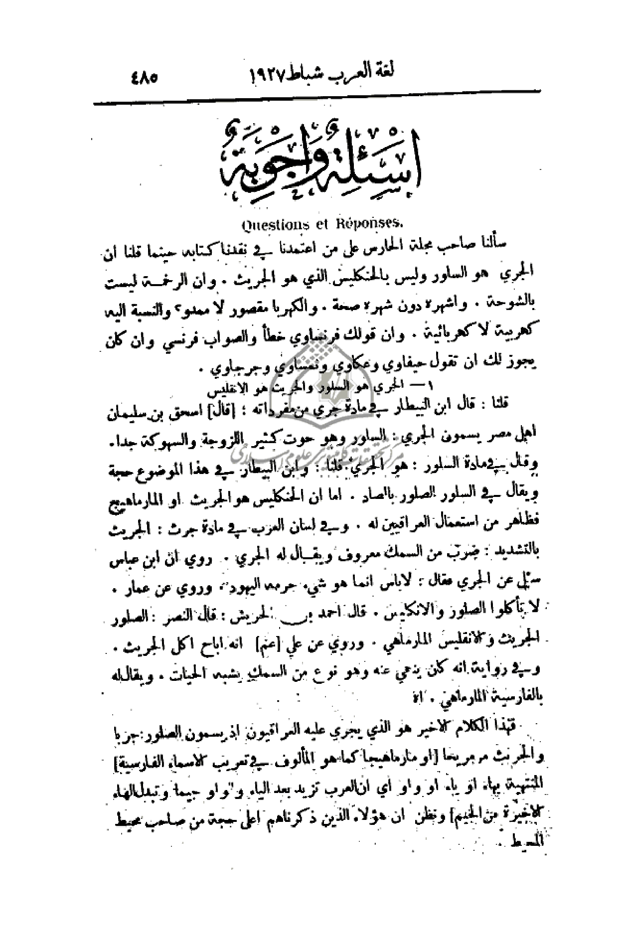 سألنا صاحب مجلة الحارس على من اعتمدنا في نقدنا كتابه حينما قلنا إن الجري هو السلور وليس بالحنكليس الذي هو الجريث. وإن الرخمة ليست بالشوحة. وأشهره دون شهره صحة. والكهربا مقصور لا ممدود والنسبة إليه كهربية لا كهربائية. وإن قولك فرنساوي خطأ والصواب فرنسي وإن كان يجوز لك أن تقول حيفاوي وعكاوي ونمساوي وجرجاوي.
