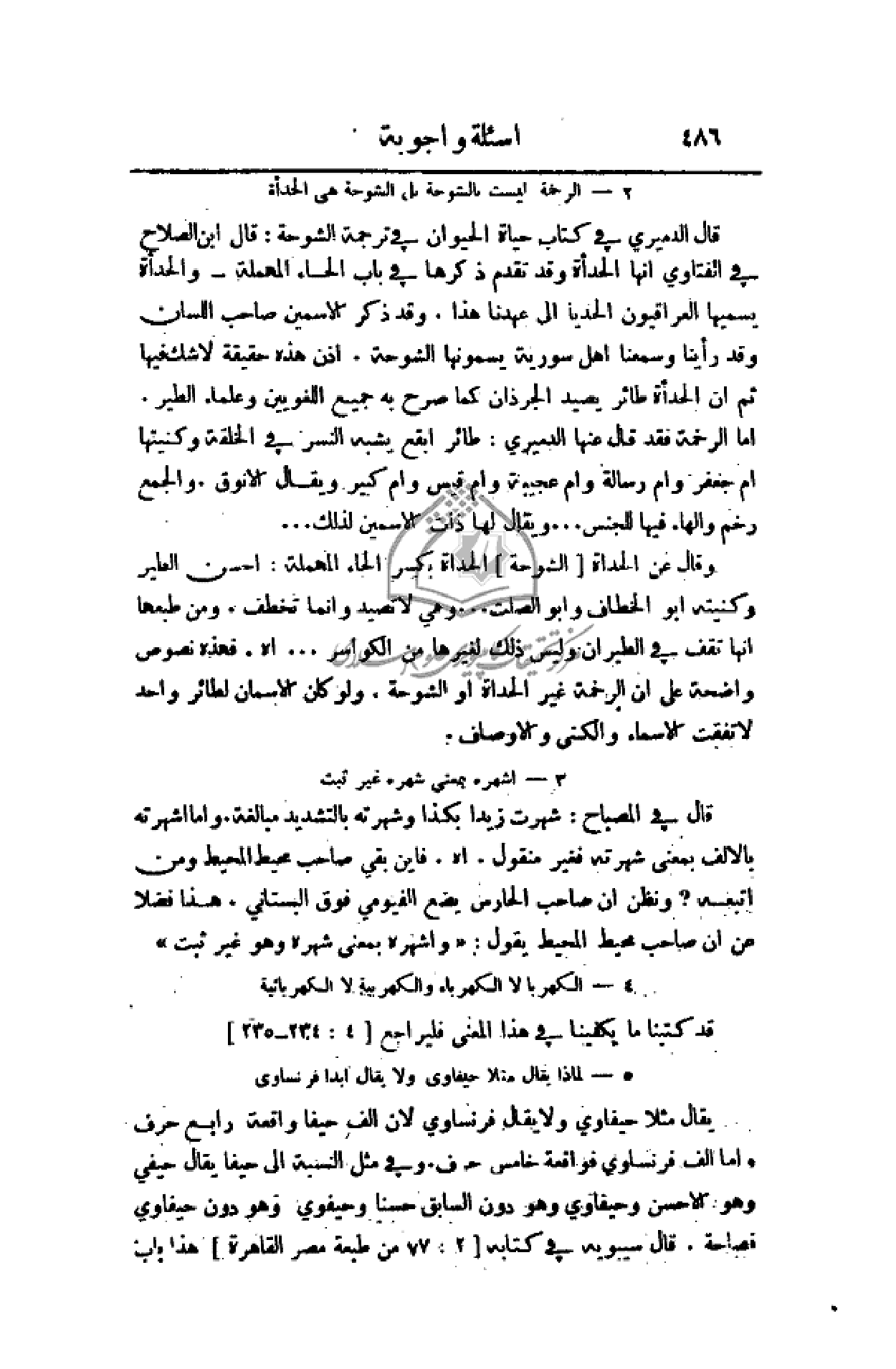هذا. وقد ذكر الاسمين صاحب اللسان وقد رأينا وسمعنا أهل سورية يسمونها الشوحة. إذن هذه حقيقة لا شك فيها ثم أن الحدأة طائر يصيد الجرذان كما صرح به جميع اللغويين وعلماء الطير. أما الرخمة فقد قال عنها الدميري: طائر أبقع يشبه النسر في الخلقة وكنيتها أم جعفر وأم رسالة وأم عجيبة وأم قيس وأم كبير ويقال الانوق. والجمع رخم والهاء فيها للجنس. . . ويقال لها ذات الاسمين لذلك. . .