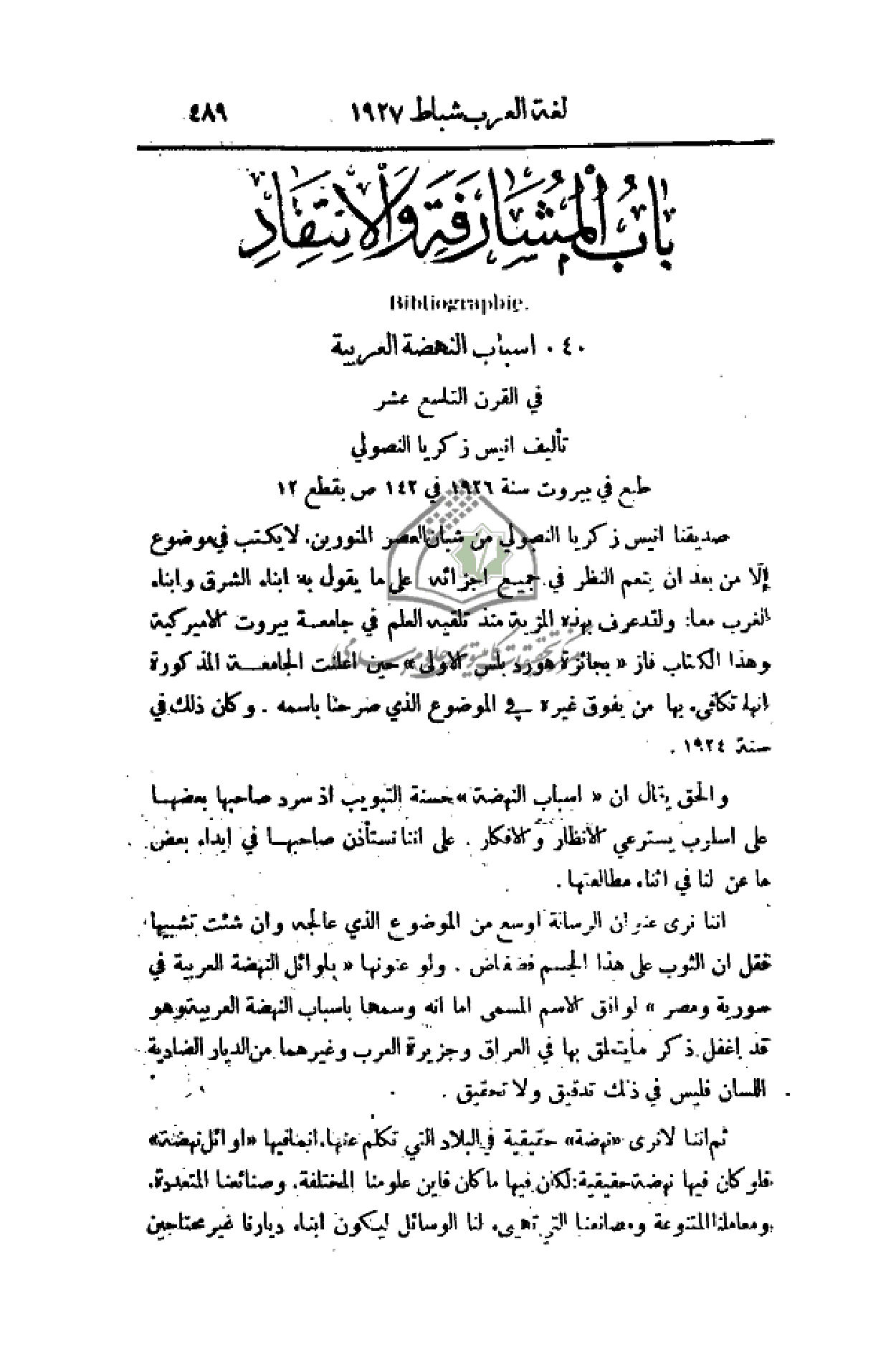 صديقنا أنيس زكريا النصولي من شبان العصر المنورين. لا يكتب في موضوع إلاَّ من بعد أن ينعم النظر في جميع أجزائه على ما يقول به أبناء الشرق وأبناء الغرب معا؛ ولقد عرف بهذه المزية منذ تلقيه العلم في جامعة بيروت الأميركية وهذا الكتاب فاز (بجائزة هوردبلس الأولى) حين أعلنت الجامعة المذكورة أنها تكافئ بها من يفوق غيره في الموضوع الذي صرحنا باسمه. وكان ذلك في سنة 1924.