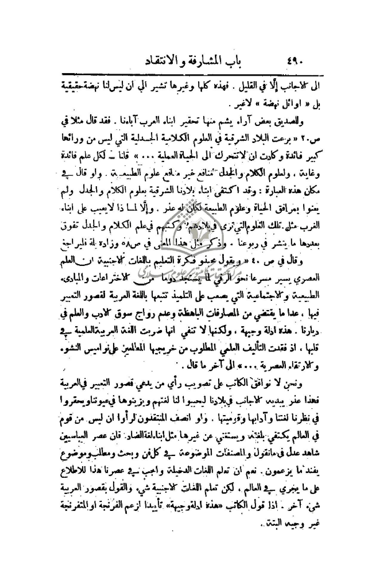 غير منافع علوم الطبيعة. ولو قال في مكان هذه العبارة: وقد اكتفى أبناء بلادنا الشرقية بعلوم الكلام والجدل ولم يعنوا بمرافق الحياة وعلوم الطبيعة لكان له عذر. وإلاَّ لماذا لا يعيب على أبناء الغرب مثل تلك العلوم التي ترى في بلادهم وكتبهم في علم الكلام والجدل تفوق بعددها ما ينشر في ربوعنا. وذكر مثل هذا المعنى في ص58 وزاده به فليراجع