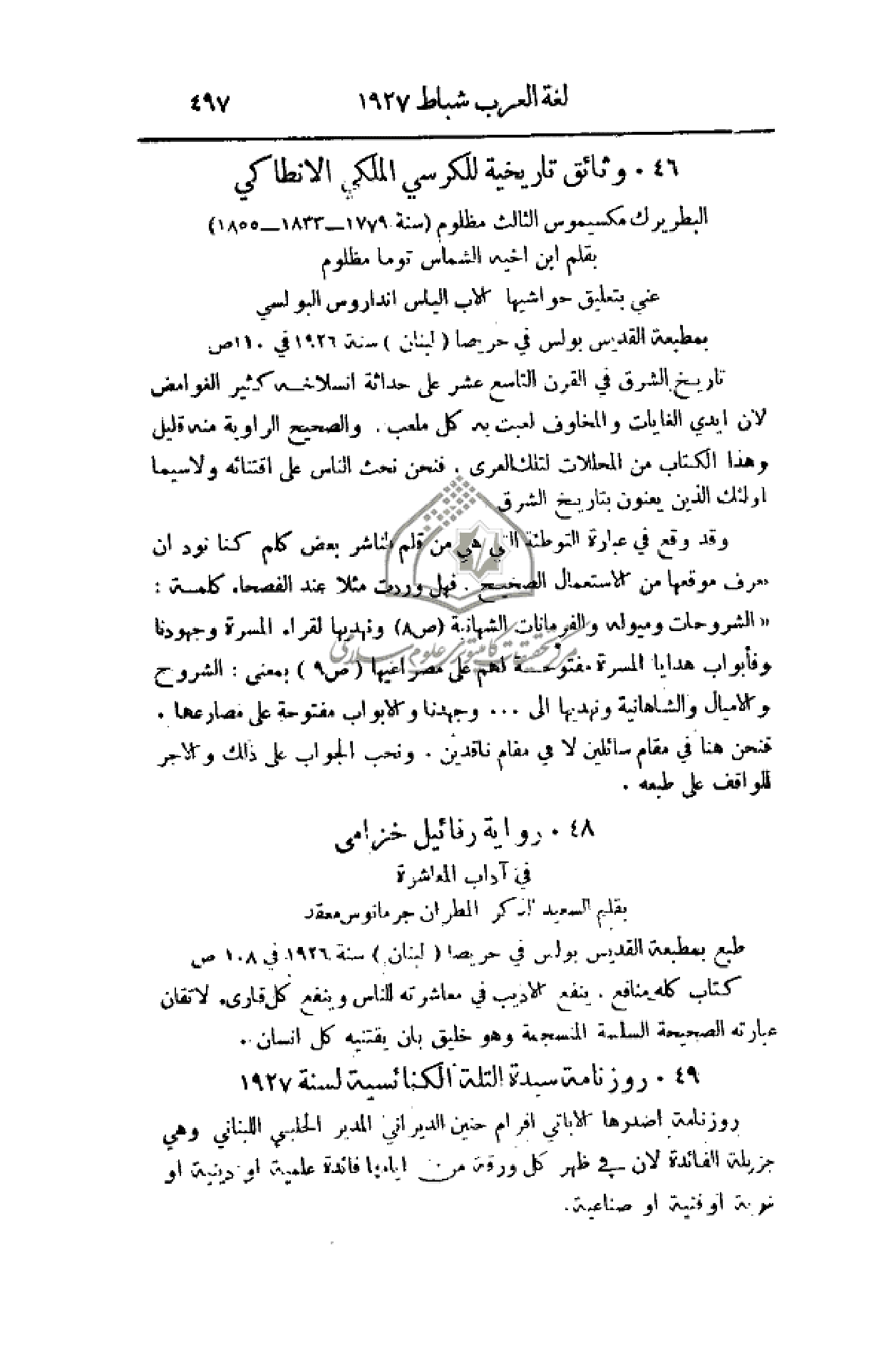 بقلم السعيد الذكر المطران جرمانوس معقد، طبع بمطبعة القديس بولس في حريصا (لبنان) سنة 1926 في 108ص