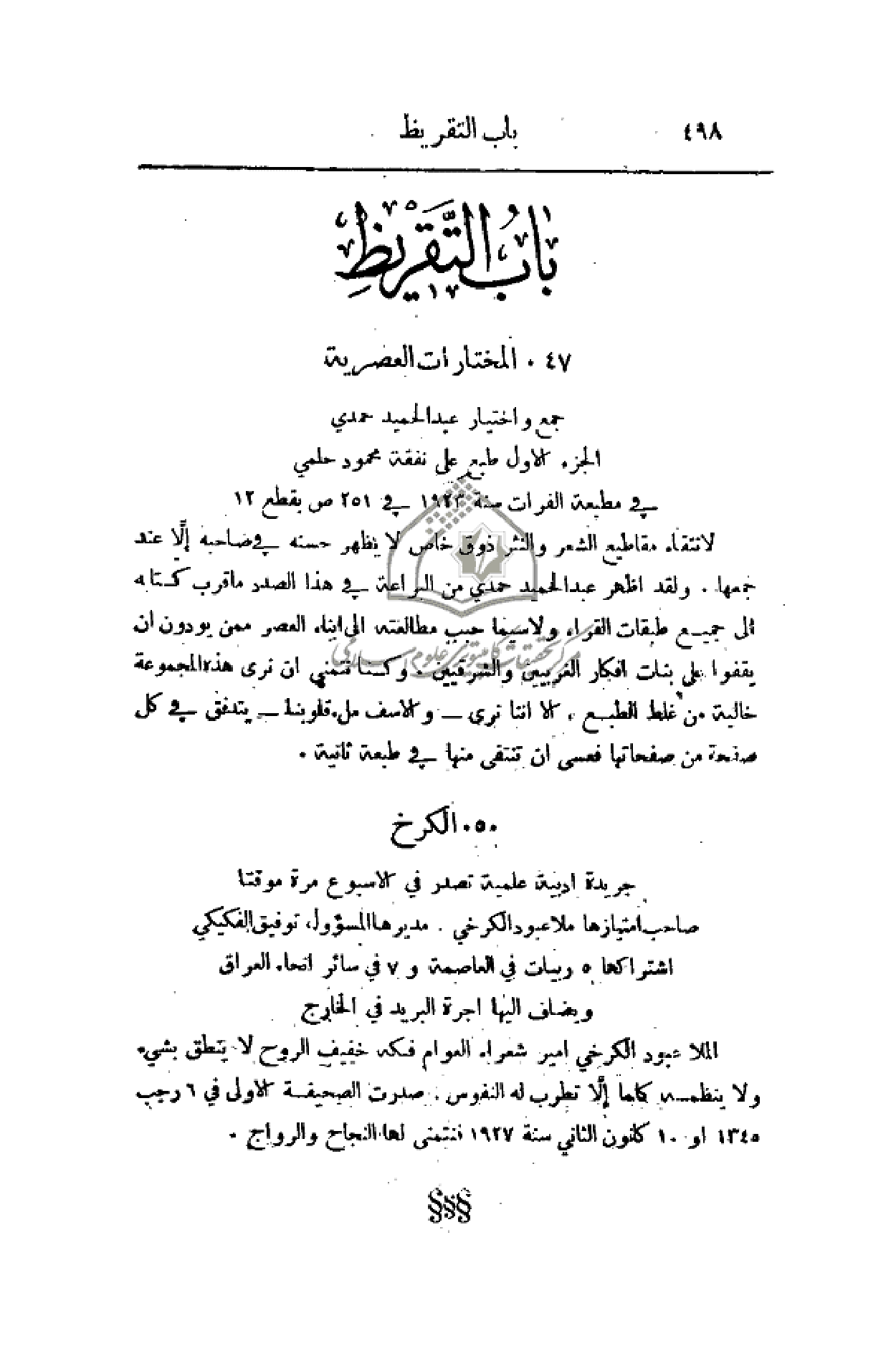 جمع واختيار عبد الحميد حمدي، الجزء الأول طبع على نفقة محمود حلمي، في مطبعة الفرات سنة 1923 في 251ص بقطع 12