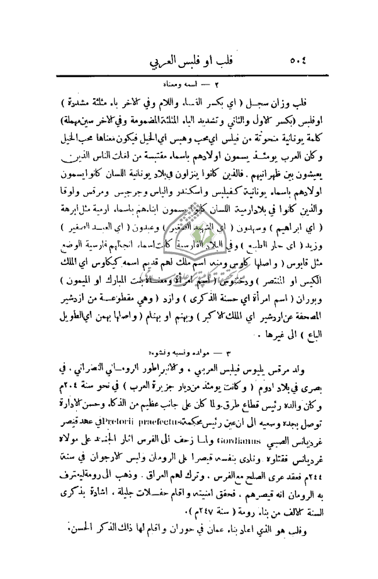 فلب وزان سجل (أي بكسر الفاء واللام وفي الآخر باء مثلثة مشددة) أو فلبس (بكسر الأول والثاني وتشديد الباء المثلثة المضمومة وفي الآخر سين مهملة) كلمة يونانية منحوتة من فيلس أي محب وهبس أي الخيل فيكون معناها محب الخيل وكان العرب يومئذ يسمون أولادهم بأسماء مقتبسة من لغات الناس الذين يعيشون بين ظهرانيهم. فالذين كانوا ينزلون في بلاد يونانية اللسان كانوا يسمون أولادهم بأسماء يونانية كفيلبس واسكندر والياس وجرجيس ومرقس ولوقا والذين كانوا في بلاد ارمية اللسان كانوا يسمون أبناءهم بأسماء ارمية مثل ابرهة (أي إبراهيم) وسهدون (أي الشهيد الصغير) وعبدون (أي العبد الصغير) وزيد (أي حار الطبع) وفي البلاد الفارسية كانت أسماء أنجالهم فارسية الوضع مثل قابوس (واصلها كاوس ومنه اسم ملك لهم قديم اسمه كيكاوس أي الملك الكيس أو المنتصر) ودختنوس (اسم امرأة ومعناه بنت المبارك أو الميمون) وبوران (اسم امرأة أي حسنة الذكرى) وأزد (وهي مقطوعة من ازدشير المصحفة عن اردشير أي الملك الأكبر) وبهنم أو بهنام (واصلها بهمن أي الطويل الباع) إلى غيرها.