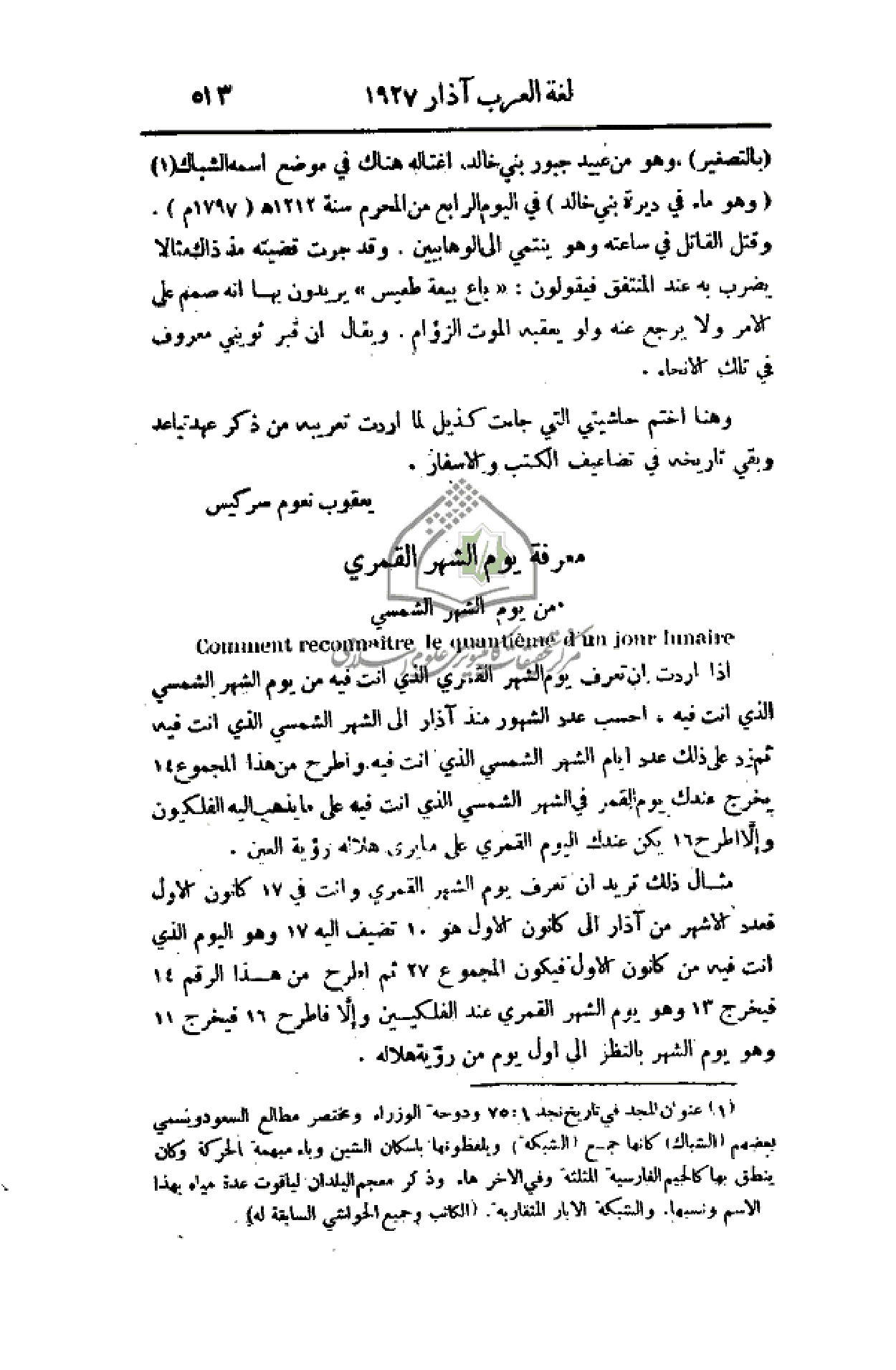 إذا أردت أن تعرف يوم الشهر القمري الذي أنت فيه من يوم الشهر الشمسي الذي أنت فيه، احسب عدد الشهور منذ آذار إلى الشهر الشمسي الذي أنت فيه ثم زد على ذلك عدد أيام الشهر الشمسي الذي أنت فيه، واطرح من هذا المجموع 14 يخرج عندك يوم القمر في الشهر الشمسي الذي أنت فيه على ما يذهب إليه الفلكيون وإلاَّ اطرح 16 يكن عندك اليوم القمري على ما يرى هلاله رؤية العين.