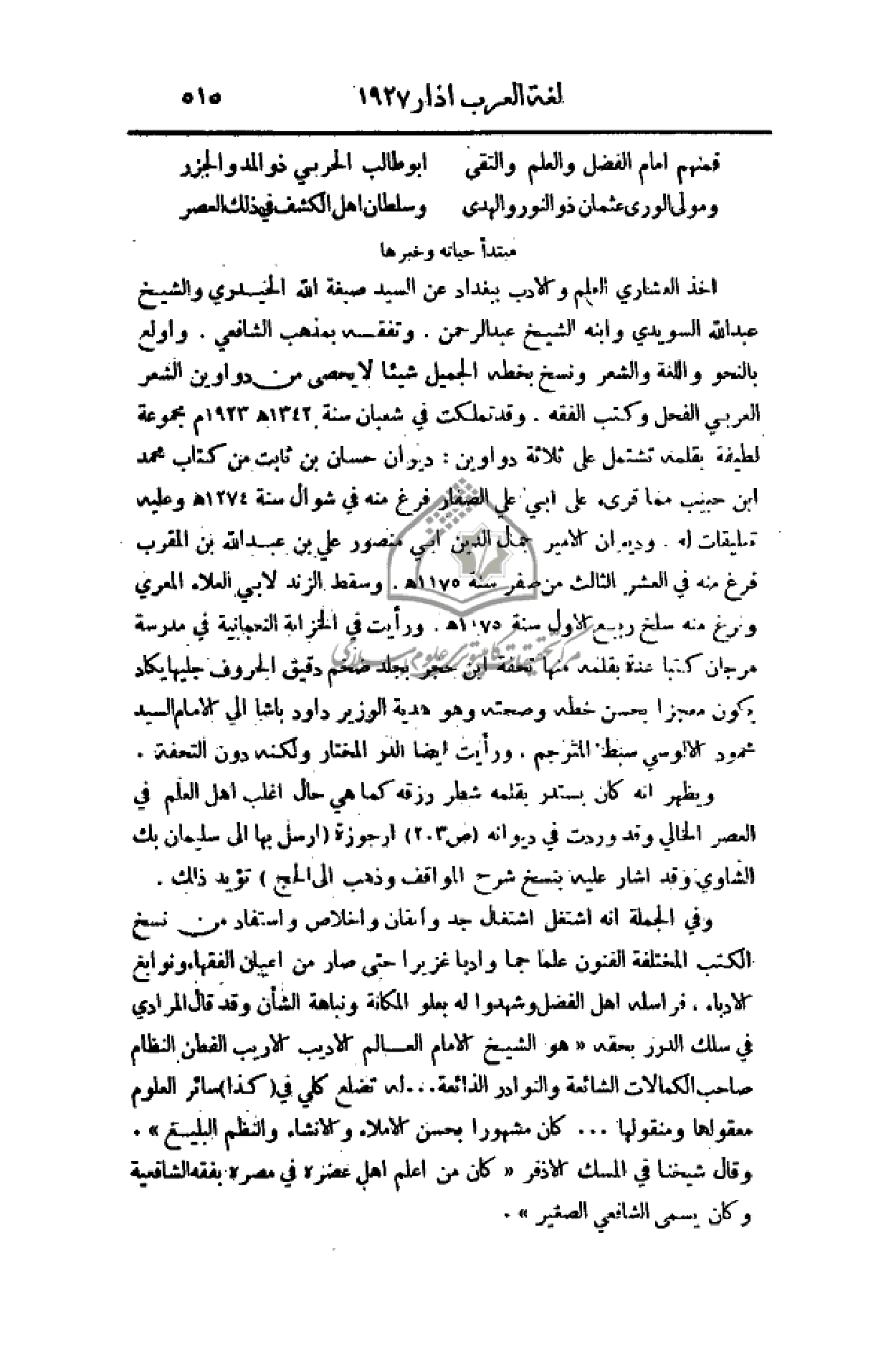 وفي الجملة إنه اشتغل اشتغال جد وإتقان وإخلاص واستفاد من نسخ الكتب المختلفة الفنون علما جما وأدبا غزيرا حتى صار من أعيان الفقهاء ونوابغ الأدباء، فراسله أهل الفضل وشهدوا له بعلو المكانة ونباهة الشأن وقد قال المرادي في سلك الدرر بحقه (هو الشيخ الإمام العالم الأديب الأريب الفطن النظام صاحب الكمالات الشائعة والنوادر الذائعة. . . له تضلع كلي في (كذا) سائر العلوم معقولها ومنقولها. . . كان مشهورا بحسن الإملاء والإنشاء والنظم البليغ). وقال شيخنا في المسك الاذفر (كان من اعلم أهل عصره في مصره بفقه الشافعية وكان يسمى الشافعي الصغير).