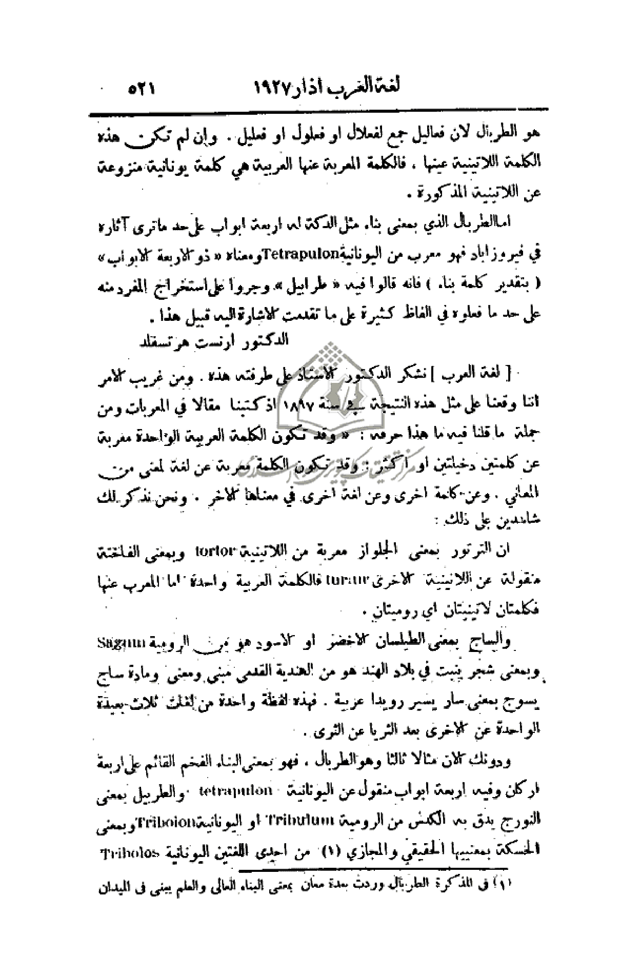 (لغة العرب) نشكر الدكتور الأستاذ على طرفته هذه. ومن غريب الأمر إننا وقعنا على مثل هذه النتيجة في سنة 1897 إذ كتبنا مقالا في المعربات ومن جملة ما قلنا فيه ما هذا حرفه: (وقد تكون الكلمة العربية الواحدة معربة عن كلمتين دخيلتين أو اكثر؛ وقد تكون الكلمة معربة عن لغة لمعنى من المعاني. وعن كلمة أخرى وعن لغة أخرى في معناها الآخر. ونحن نذكر لك شاهدين على ذلك؛