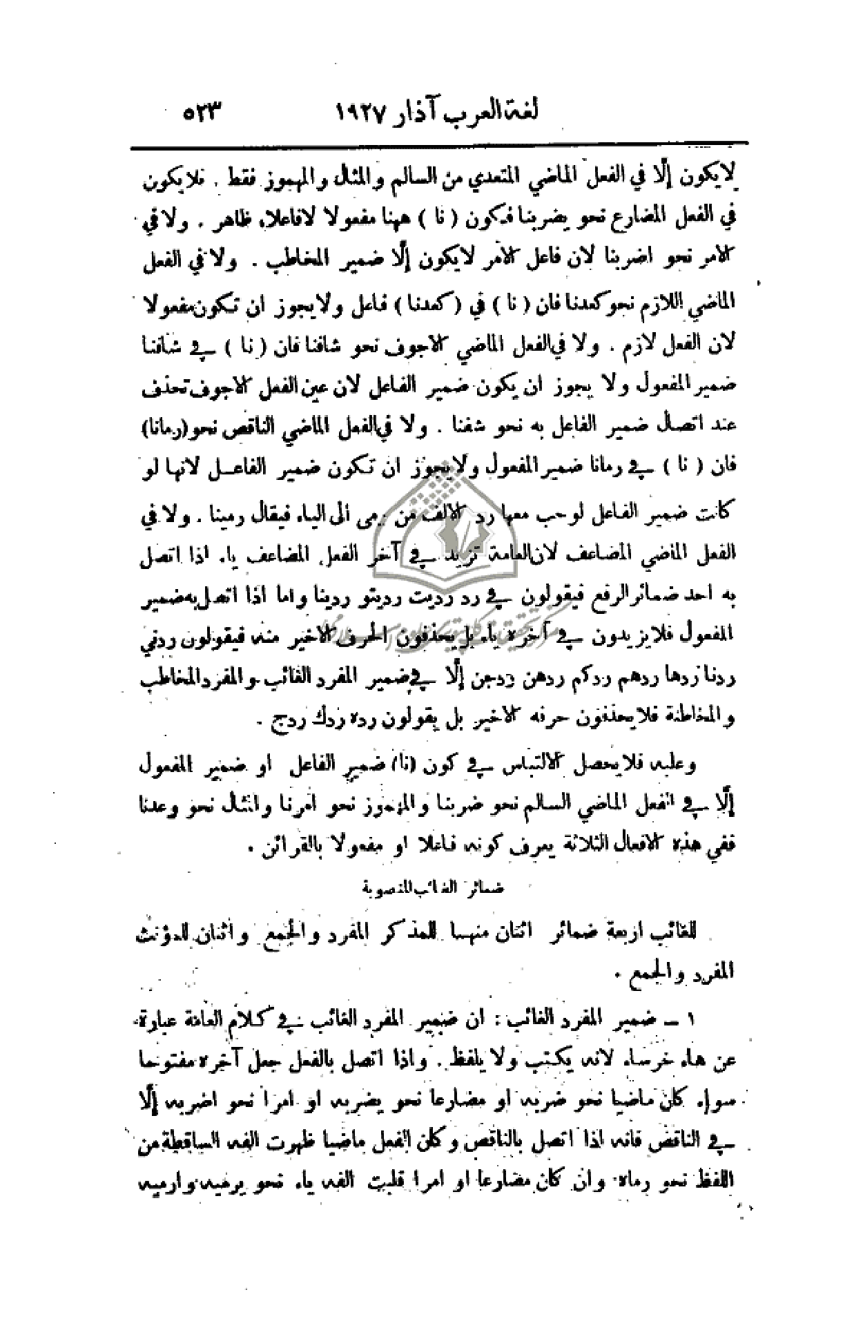 1 - ضمير المفرد الغائب: إن ضمير المفرد الغائب في كلام العامة عبارة عن هاء خرساء لأنه يكتب ولا يلفظ. وإذا اتصل بالفعل جعل آخره مفتوحا سواء كان ماضيا نحو ضربه أو مضارعا نحو يضربه أو أمرا نحو اضربه إلاَّ في الناقص فإنه إذا اتصل بالناقص وكان الفعل ماضيا ظهرت ألفه الساقطة من اللفظ نحو رماه وإن كان مضارعا أو أمرا قلبت ألفه ياء نحو يرميه وارميه