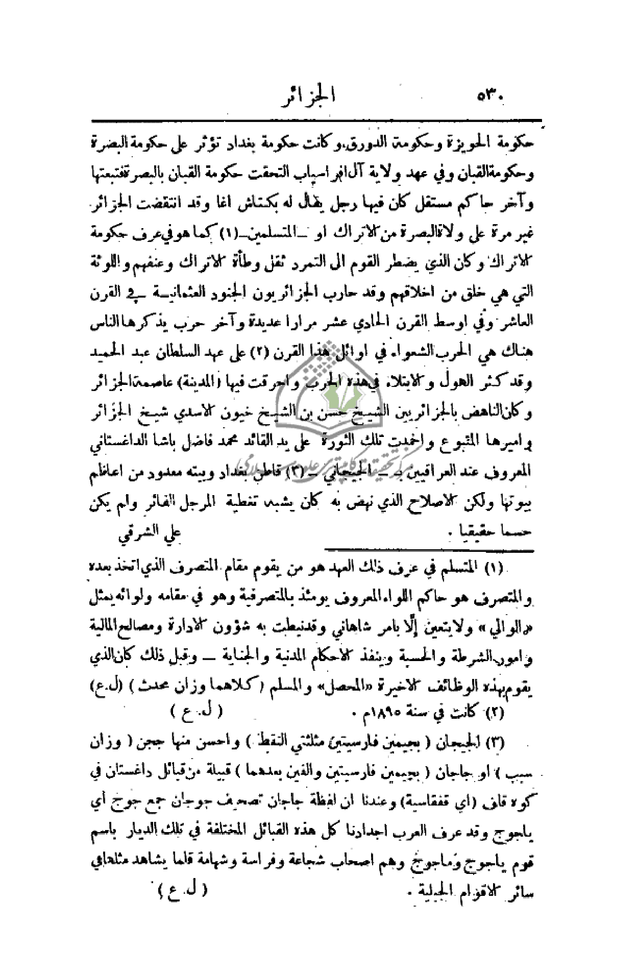 الهول والابتلاء في هذه الحرب وأحرقت فيها (المدينة) عاصمة الجزائر وكان الناهض بالجزائريين الشيخ حسن بن الشيخ خيون الاسدي شيخ الجزائر وأميرها المتبوع وأخمدت تلك الثورة على يد القائد محمد فاضل باشا الداغستاني المعروف عند العراقيين ب - الجيجاني - قاطن بغداد وبيته معدود من أعاظم بيوتها ولكن الإصلاح الذي نهض به كان يشبه تغطية المرجل الفائر ولم يكن حسما حقيقيا.