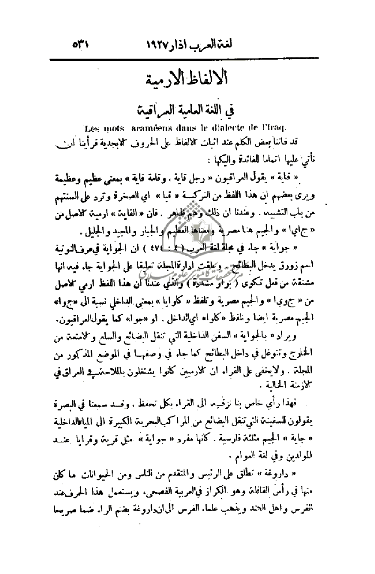 ويراد (بالجواية) السفن الداخلية التي تنقل البضائع والسلع والأمتعة من الخارج وتتوغل في داخل البطائح كما جاء في وصفها في الموضع المذكور من المجلة. ولا يخفى على القراء أن الارميين كانوا يشتغلون بالملاحة في العراق في الأزمنة الخالية.