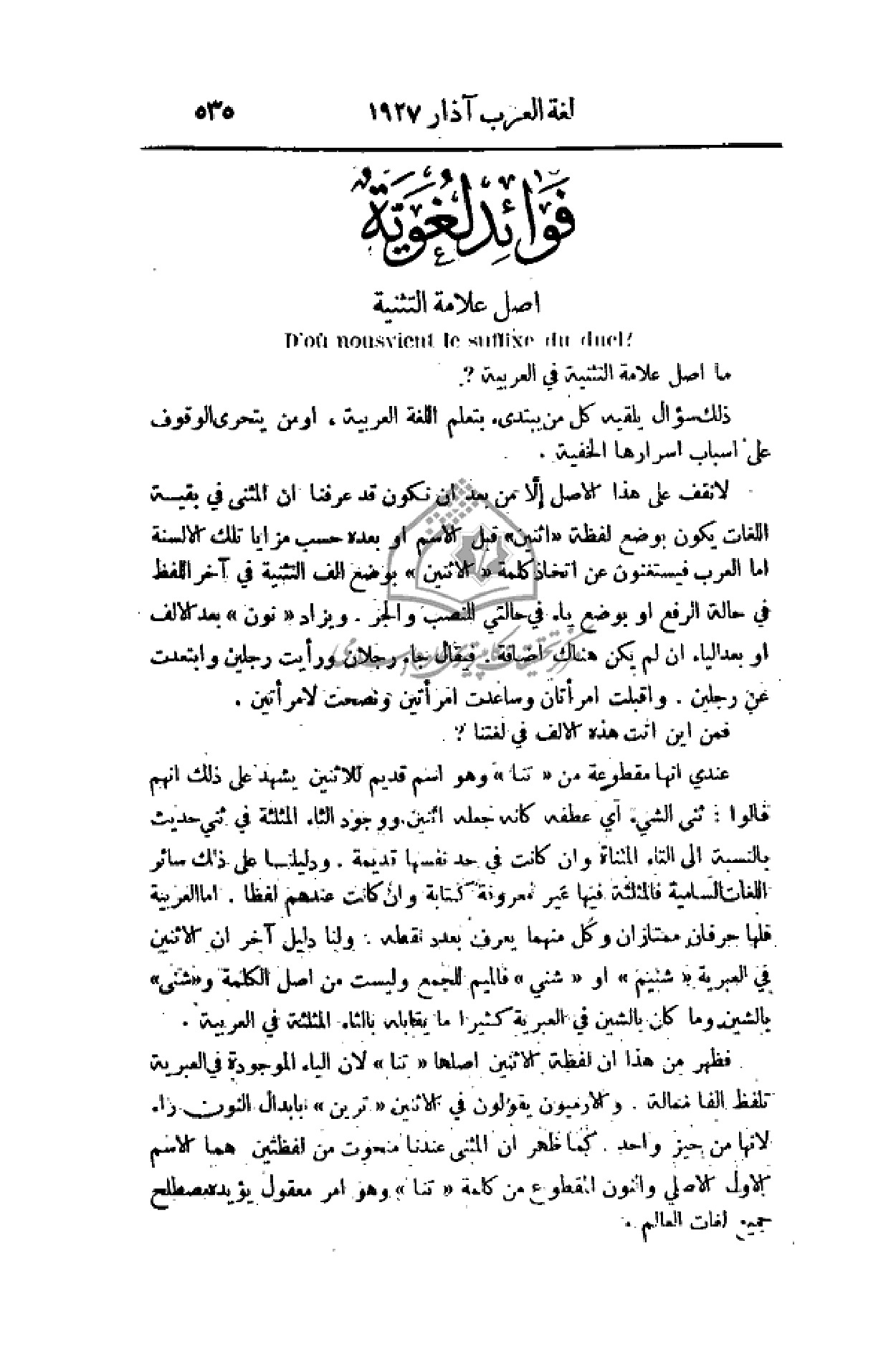 فظهر من هذا أن لفظة الاثنين أصلها (تنا) لأن الياء الموجودة في العبرية تلفظ ألفا ممالة. والارميون يقولون في الاثنين (ترين) بإبدال النون راء لأنها من حيز واحد. كما ظهر أن المثنى عندنا منحوت من لفظتين هما الاسم الأول الأصلي والنون المقطوع من كلمة (تنا) وهو أمر معقول يؤيد مصطلح جميع لغات العالم.