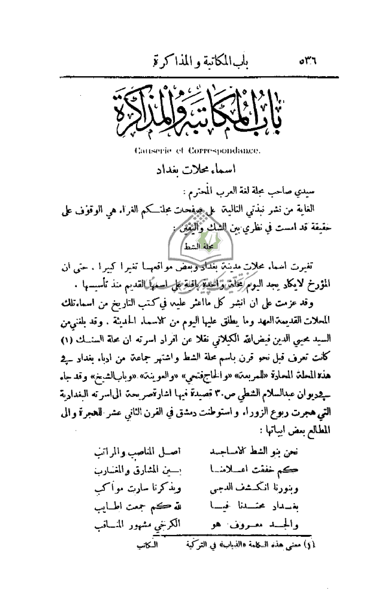 وقد عزمت على أن انشر كل ما اعثر عليه في كتب التاريخ من أسماء تلك المحلات القديمة العهد وما يطلق عليها اليوم من الأسماء الحديثة. وقد بلغني من السيد محي الدين فيض الله الكيلاني نقلا عن أفراد أسرته أن محلة السنك كانت تعرف قبل نحو قرن باسم محلة الشط واشتهر جماعة من أدباء بغداد في هذه المحلة المحادة (للمربعة) (والحاج فتحي) (والعوينة) (وباب الشيخ) وقد جاء في ديوان عبد السلام الشطي ص30 قصيدة فيها إشارة صريحة إلى أسرته البغدادية التي هجرت ربوع الزوراء واستوطنت دمشق في القرن الثاني عشر للهجرة وإلى المطالع بعض أبياتها: