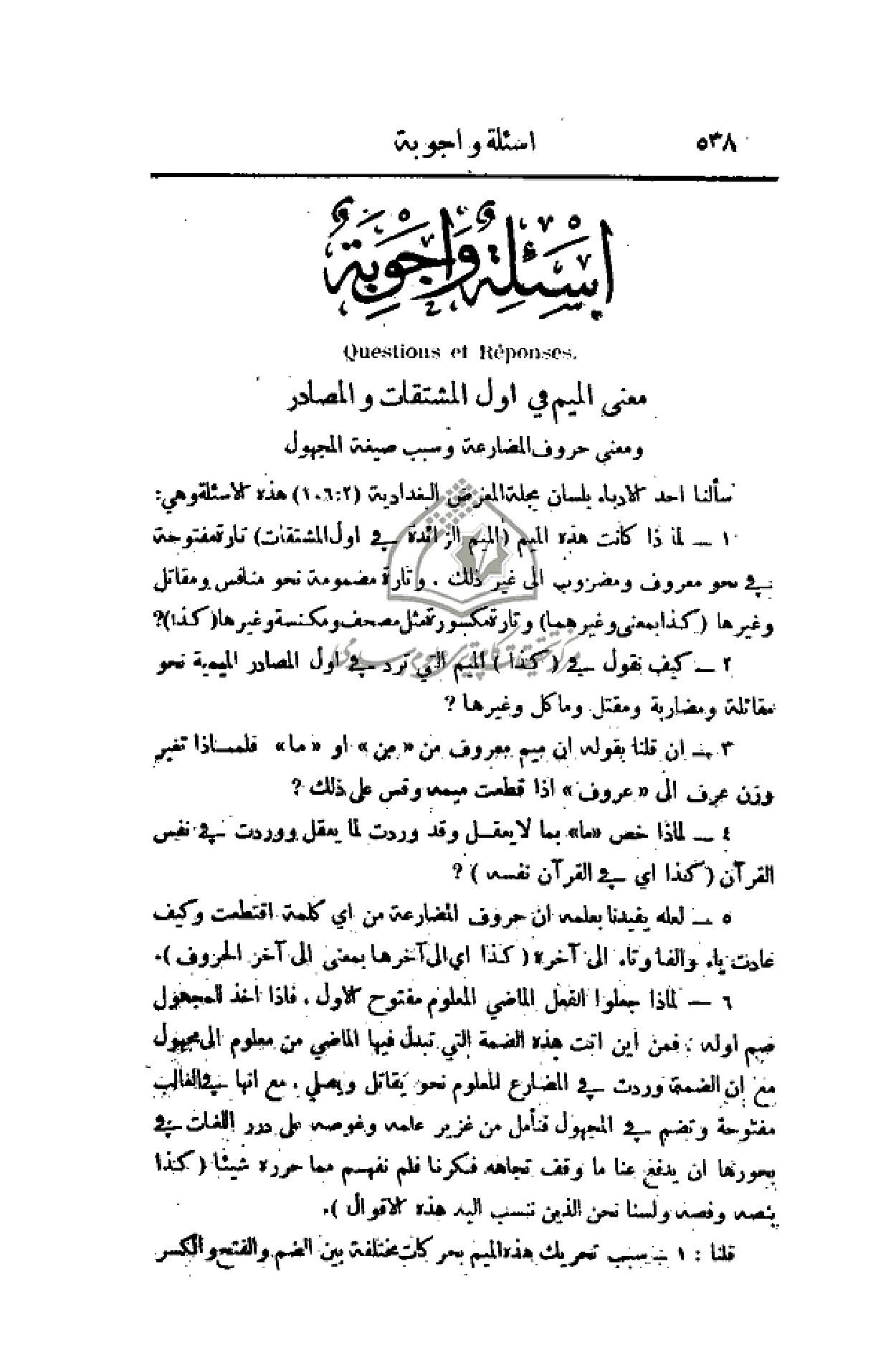 6 - لماذا جعلوا الفعل الماضي المعلوم مفتوح الأول، فإذا أخذ للمجهول ضم أوله. فمن أين أتت هذه الضمة التي تبدل فيها الماضي من معلوم إلى مجهول مع أن الضمة وردت في المضارع المعلوم نحو يقاتل ويصلي، مع أنها في الغالب مفتوحة وتضم في المجهول فنأمل من غزير علمه وغوصه على درر اللغات في بحورها أن يدفع عنا ما وقف تجاهه فكرنا فلم نفهم مما حرره شيئا (كذا بنصه وفصه ولسنا نحن الذين ننسب إليه هذه الأقوال).
