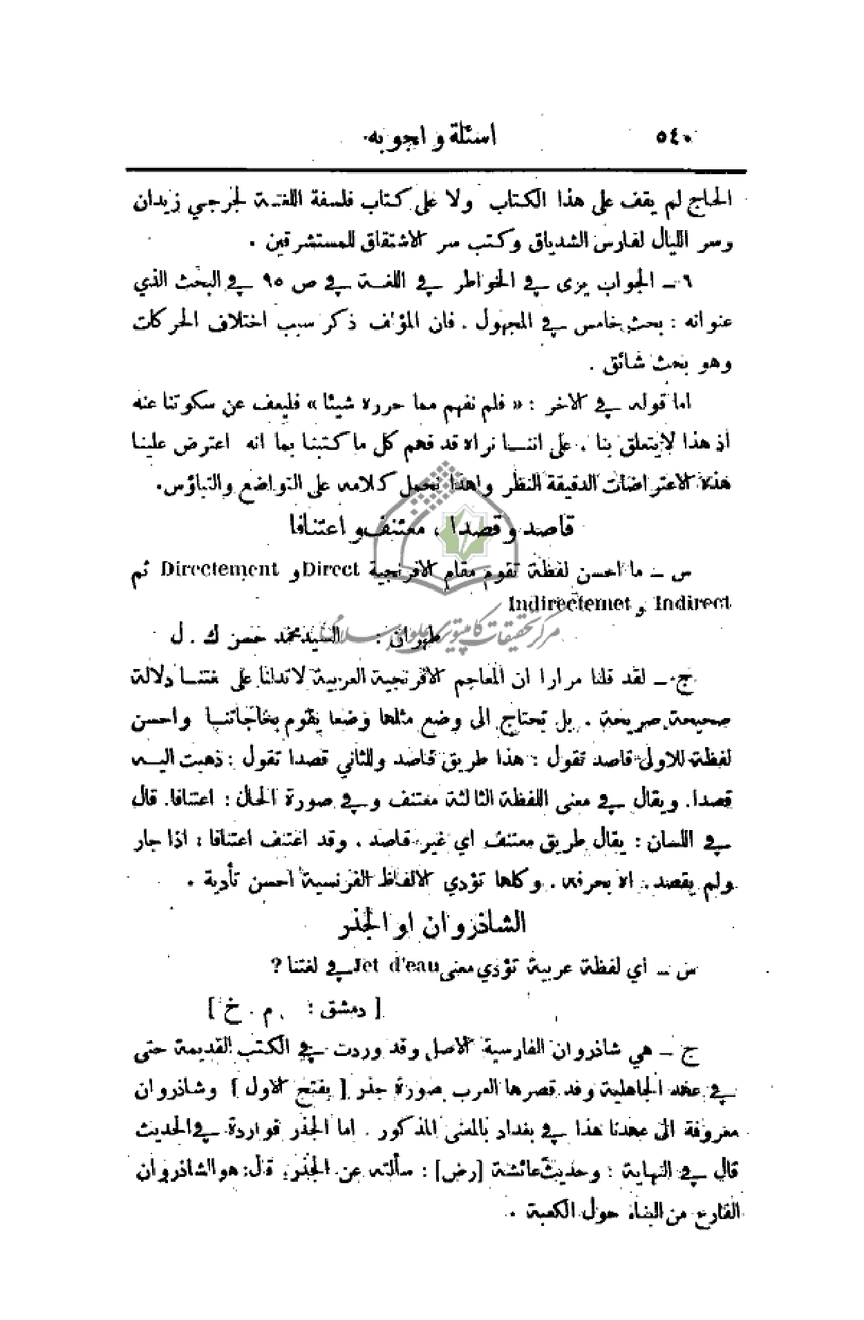 ج - لقد قلنا مرارا أن المعاجم الإفرنجية العربية لا تدلنا على لغتنا دلالة صحيحة صريحة، بل تحتاج إلى وضع مثلها وضعا يقوم بحاجاتنا وأحسن لفظة للأولى قاصد تقول: هذا طريق قاصد وللثاني قصدا تقول: ذهبت إليه قصدا. ويقال في معنى اللفظة الثالثة معتنف وفي صورة الحال: اعتنافا. قال في اللسان: يقال طريق معتنف أي غير قاصد. وقد اعتنف اعتنافا: إذا جار ولم يقصد. أهـ بحرفه. وكلها تؤدي الألفاظ الفرنسية أحسن تأدية.