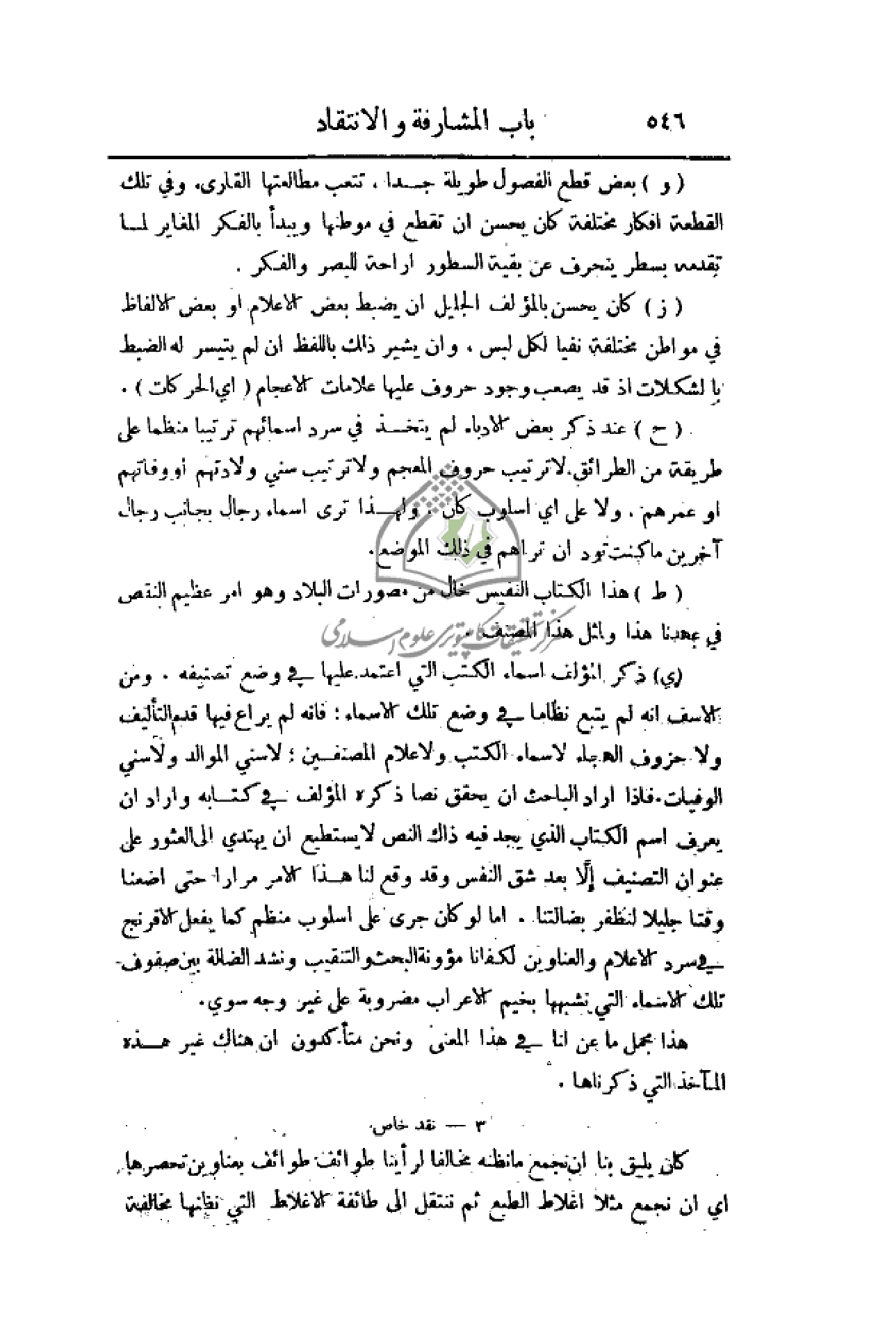 (و) بعض قطع الفصول طويلة جدا، تتعب مطالعتها القارئ وفي تلك القطعة أفكار مختلفة كان يحسن أن تقطع في موطنها ويبدأ بالفكر المغاير لما تقدمه بسطر ينحرف عن بقية السطور إراحة للبصر والفكر.