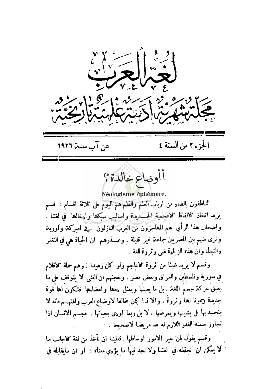 الناطقون بالضاد من أرباب العلم والقلم هم اليوم على ثلاثة أقسام: قسم يريد اتخاذ الألفاظ الأعجمية الجديدة وأساليب سبكها وإدخالها في لغتنا. وأصحاب هذا الرأي هم المهاجرون من العرب النازلون في أميركة وأوربة وترى منهم بين المصريين جماعة غير قليلة. وعذرهم أن الحياة هي في التغير والتبدل وان هذه الزيادة غنى وثروة للغة.