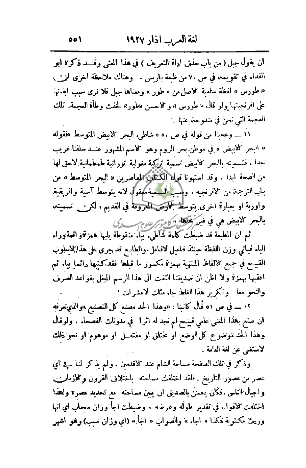 11 - وعجبنا من قوله في ص50 (شاطئ البحر الأبيض المتوسط) فقوله (البحر الأبيض) في موطن بحر الروم وهو الاسم المشهور عند سلفنا غريب جدا. فتسميته بالبحر الأبيض تسمية تركية مغولية تورانية طمطمانية لا حق لها من الصحة أبدا. وقد استهونا قول الكتاب المعاصرين (البحر المتوسط) من باب الترجمة من الإفرنجية. وسبب التسمية معقول لأنه يتوسط آسية وأفريقية وأوربة أو بعبارة أخرى يتوسط الأرض المعروفة في القديم، لكن تسميته بالبحر الأبيض هي في غير محلها.