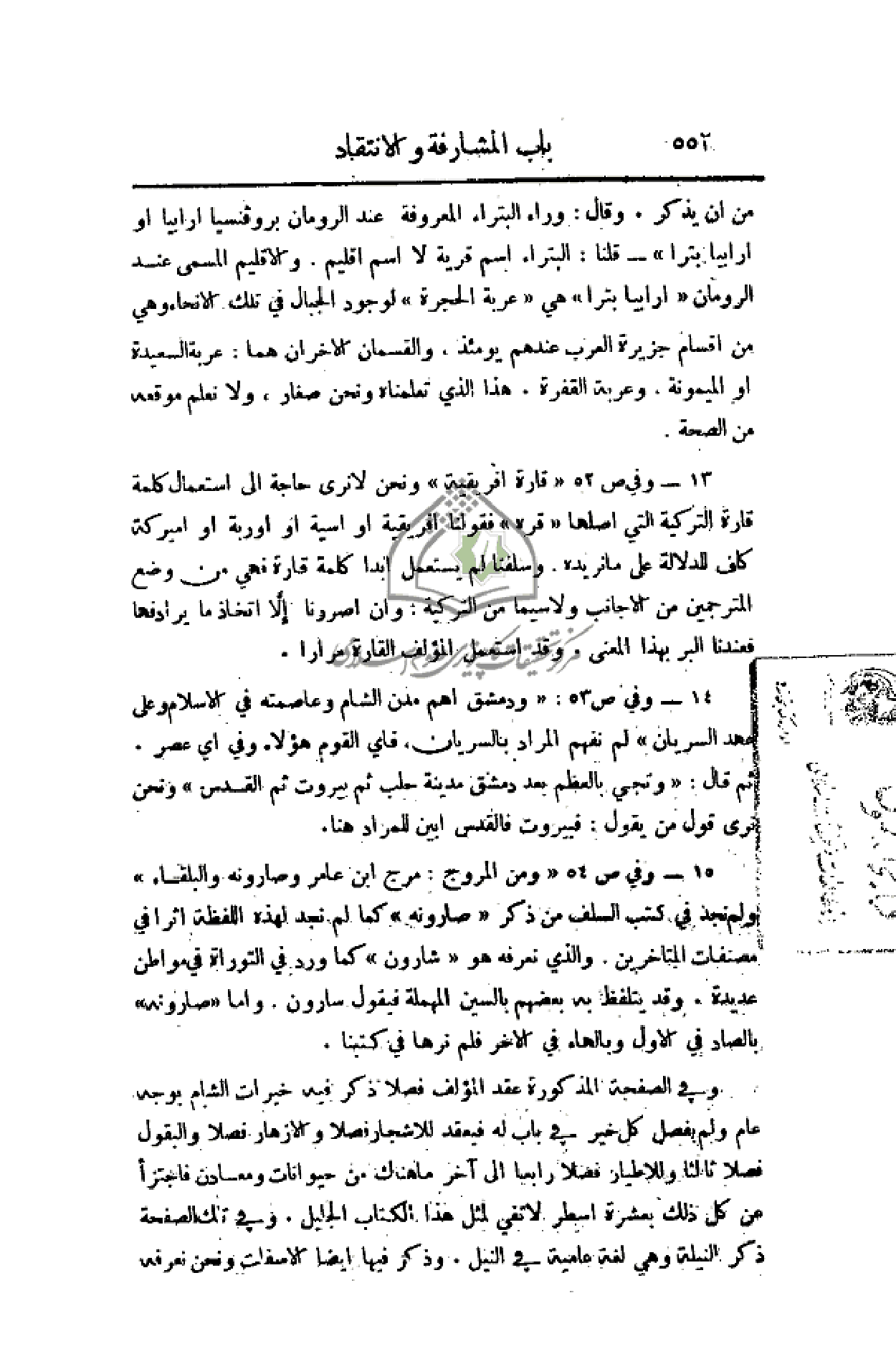 15 - وفي ص54 (ومن المروج: مرج ابن عامر وصارونه والبلقاء) ولم نجد في كتب السلف من ذكر (صارونه) كما لم نجد لهذه اللفظة أثرا في مصنفات المتأخرين. والذي نعرفه هو (شارون) كما ورد في التوراة في مواطن عديدة. وقد يتلفظ به بعضهم بالسين المهملة فيقول سارون. وأما (صارونه) بالصاد في الأول وبالهاء في الآخر فلم نرها في كتبنا.