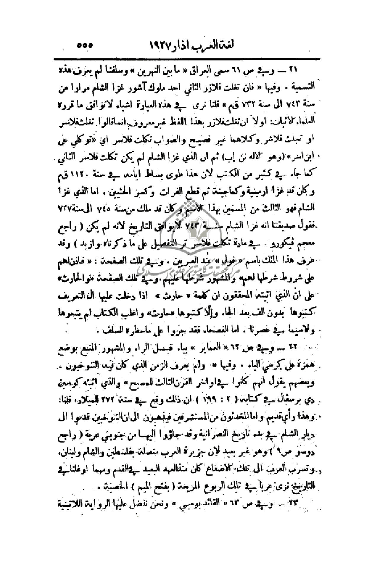 والصواب تكلت فلاسر أي متوكلي على ابن اسر) (وهو الإله فن إب) ثم أن الذي غزا الشام لم يكن تكلت فلاسر الثاني كما جاء في كثير من الكتب لأن هذا طوى بساط أيامه في سنة 112 ق م وكان قد غزا أرمينية وكماجينة ثم قطع الفرات وكسر الحثيين. أما الذي غزا الشام فهو الثالث من المسمين بهذا الاسم وكان قد ملك من سنة 745 إلى سنة 747 فقول صديقنا إنه غزا الشام سنة 743 لا يوافق التاريخ لأنه لم يكن (راجع معجم فيكورو. في مادة تكلت فلاسر تر التفصيل على ما ذكرناه وأزيد) وقد عرف هذا الملك باسم (فول) عند العبريين. وفي تلك الصفحة: (فأذن لهم على شروط شرطها لهم) والمشهور شرطها عليهم. وفي تلك الصفحة (والحارث) على أن الذي أثبته المحققون أن كلمة (حارث) إذا دخلت عليها ال التعريف كتبوها بدون ألف بعد الحاء وإلاَّ كتبوها (حارث) وأغلب الكتاب لم يتبعوها ولا سيما في عصرنا. أما الفصحاء فقد جروا على ما حضره السلف.