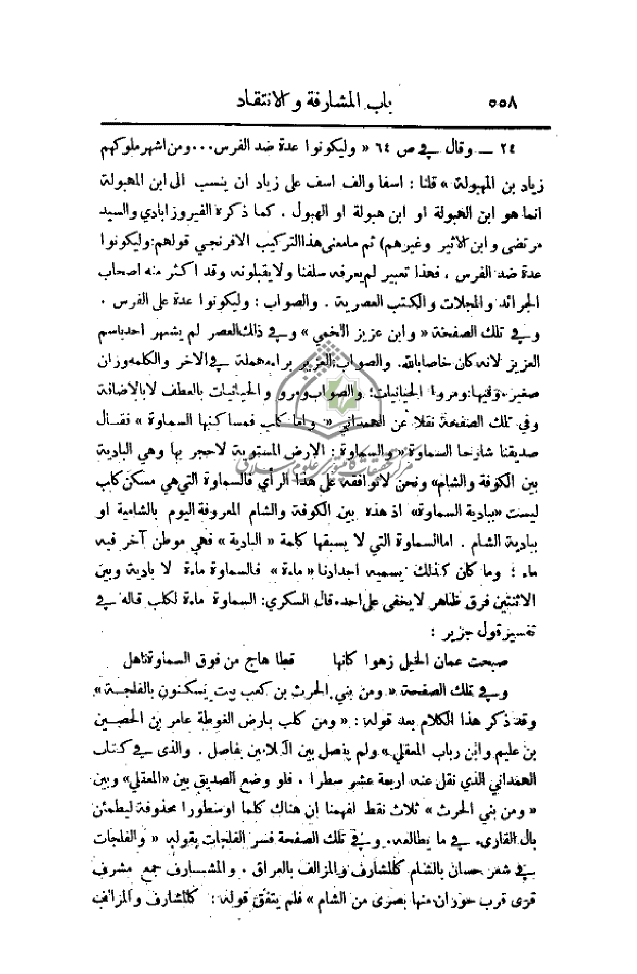 24 - وقال في ص64 (وليكونوا عدة ضد الفرس. . . ومن أشهر ملوكهم زياد بن المهبولة) قلنا: أسفا وألف أسف على زياد أن ينسب إلى ابن المهبولة إنما هو ابن الهبولة أو ابن هبولة أو الهبول، كما ذكره الفيروزابادي والسيد مرتضى وابن الأثير وغيرهم) ثم ما معنى هذا التركيب الإفرنجي قولهم: وليكونوا عدة ضد الفرس، فهذا تعبير لم يعرفه سلفنا ولا يقبلونه وقد اكثر منه أصحاب الجرائد والمجلات والكتب العصرية. والصواب: وليكونوا عدة على الفرس. وفي تلك الصفحة (وابن عزيز اللخمي) وفي ذلك العصر لم يشتهر أحد باسم العزيز لأنه كان خاصا بالله. والصواب: العزير براء مهملة في الآخر والكلمة وزان صغير. وفيها: ومروا الحيانيات؛ والصواب ومرو والحيانيات بالعطف لا بالإضافة وفي تلك الصفحة نقلا عن الهمداني (وأما كلب فمساكنها السماوة) فقال صديقنا شارحا السماوة (والسماوة: الأرض المستوية لا حجر بها وهي البادية بين الكوفة والشام) ونحن لا نوافقه على هذا الرأي فالسماوة التي هي مسكن كلب ليست (ببادية السماوة) إذ