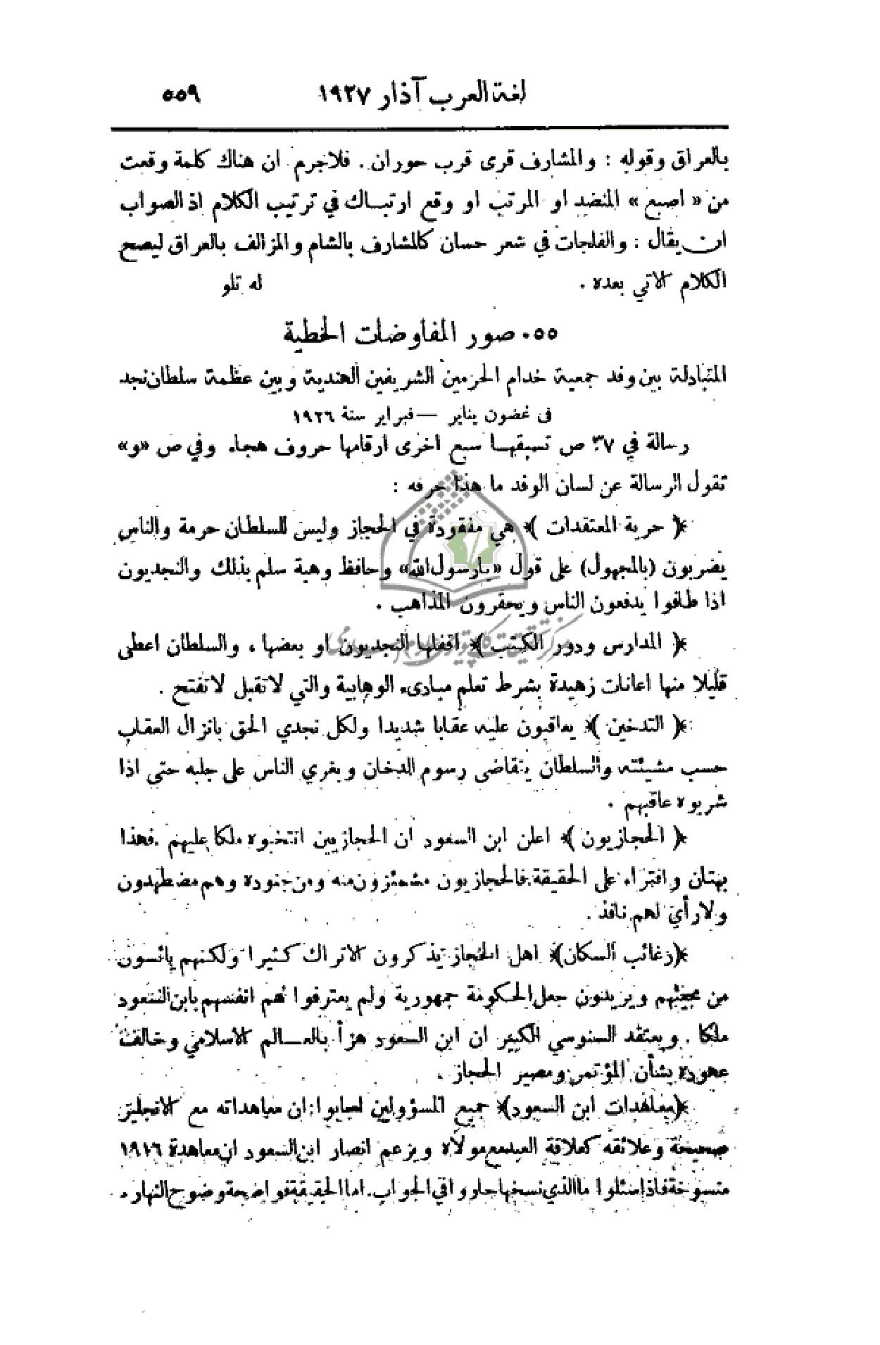 (الحجازيون) أعلن ابن السعود أن الحجازيين انتخبوه ملكا عليهم. فهذا بهتان وافتراء على الحقيقة فالحجازيون مشمئزون منه ومن جنوده وهم مضطهدون ولا رأي لهم نافذ.