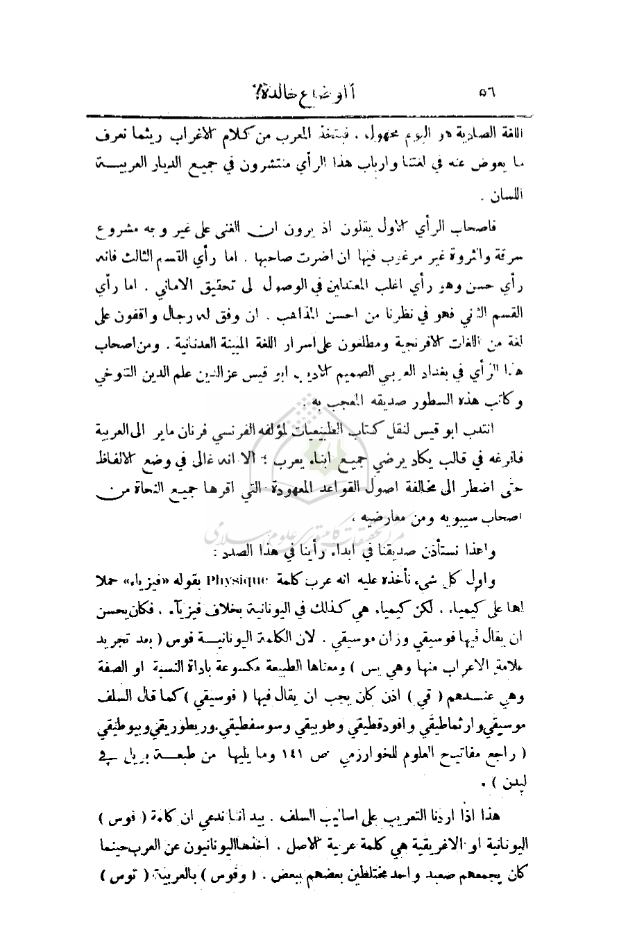 وأول كل شيء نأخذه عليه انه عرب كلمة بقوله (فيزياء) حملا لها على كيمياء. لكن كيمياء هي كذلك في اليونانية بخلاف فيزياء. فكان يحسن أن يقال فيها فوسيقي وزن موسيقي. لأن الكلمة اليونانية فوس (بعد تجريد علامة الإعراب منها وهي س) ومعناها الطبيعة مكسوعة بأداة النسبة أو الصفة وهي عندهم (قي) إذن كان يجب أن يقال فيها (فوسيقي) كما قال السلف موسيقي وارثماطيقي وافودقطيقي وطوبيقي وسوسفطيقي وريطوريقي وبيوطيقي (راجع مفاتيح العلوم للخوارزمي ص141 وما يليها من طبعة بويل في ليدن).
