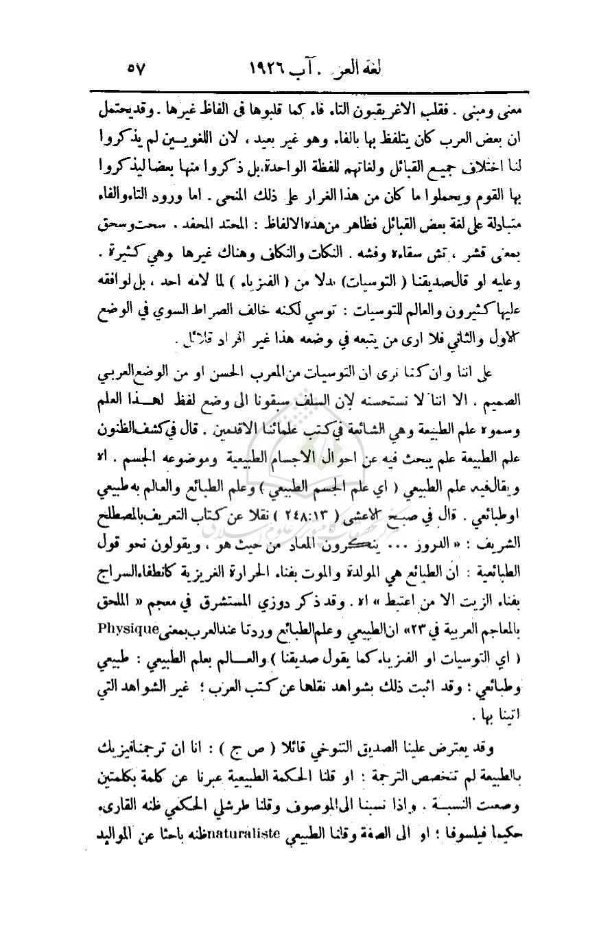 على إننا وأن كنا نرى أن التوسيات من المعرب الحسن أو من الوضع العربي الصميم. إلا أننا لا نستحسنه لأن السلف سبقونا إلى وضع لفظ لهذا العلم وسموه علم الطبيعة وهي الشائعة في كتب علمائنا الأقدمين. قال في كشف الظنون علم الطبيعة علم يبحث فيه عن أحوال الأجسام الطبيعية وموضوعة الجسم. أهـ ويقال فيه علم الطبيعي (أي علم الجسم الطبيعي) وعلم الطبائع والعالم به طبيعي أو طبائعي. قال في صبح الأعشى (248: 13) نقلا عن كتاب التعريف بالمصطلح الشريف: (الدروز. . . ينكرون المعاد من حيث هو،