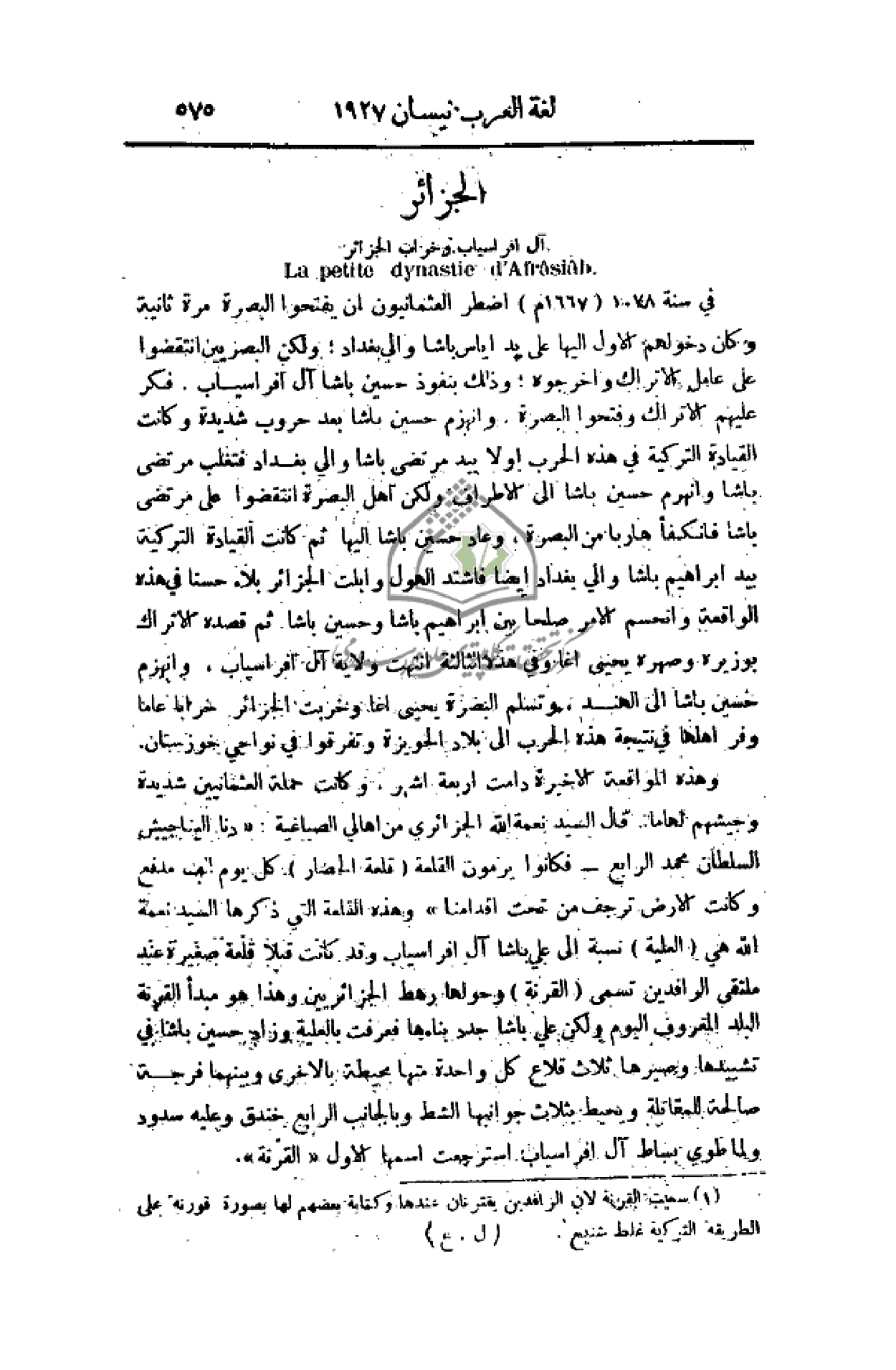 في سنة 1078 (1667م) اضطر العثمانيون أن يفتحوا البصرة مرة ثانية وكان دخولهم الأول إليها على يد اياس باشا والي بغداد؛ ولكن البصريين انتقضوا على عامل الأتراك وأخرجوه؛ وذلك بنفوذ حسين باشا آل افراسياب، فكرَّ عليهم الأتراك وفتحوا البصرة. وانهزم حسين باشا بعد حروب شديدة وكانت القيادة التركية في هذه الحرب أول بيد مرتضى باشا والي بغداد فتغلب مرتضى باشا وانهزم حسين باشا إلى الأطراف ولكن أهل البصرة انتقضوا على مرتضى باشا فاتكفأ هاربا من البصرة. وعاد حسين باشا إليها ثم كانت القيادة التركية بيد إبراهيم باشا والي بغداد أيضا فأشتد الهول وأبلت الجزائر بلاء حسنا في هذه الواقعة وانحسم الأمر صلحا بين إبراهيم باشا وحسين باشا ثم قصده الأتراك بوزيره وصهره يحيى اغا وفي هذه الثالثة انتهت ولاية آل افراسياب، وانهزم حسين باشا إلى الهند، وتسلم البصرة يحيى اغا وخربت الجزائر خرابا عاما وفر أهلها في نتيجة هذه الحرب إلى بلاد الحويزة وتفرقوا في نواحي خوزستان.